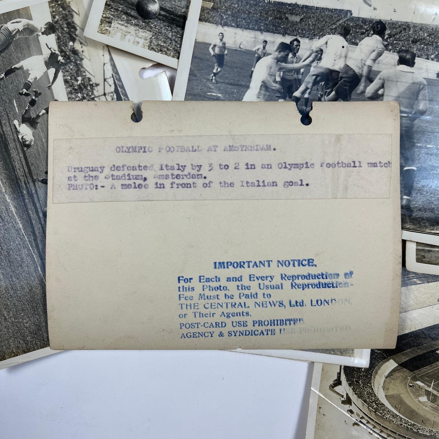 Conjunto de trece fotografías de prensa realizadas por The Central News, Londres, con sello húmedo en reverso y descripciones mecanografiadas en los anversos. «Selección Uruguaya de Fútbol en los Juegos Olímpicos de 1928.» 17 x 12 cm. Presentan averías y perforaciones laterales de encuadernación.