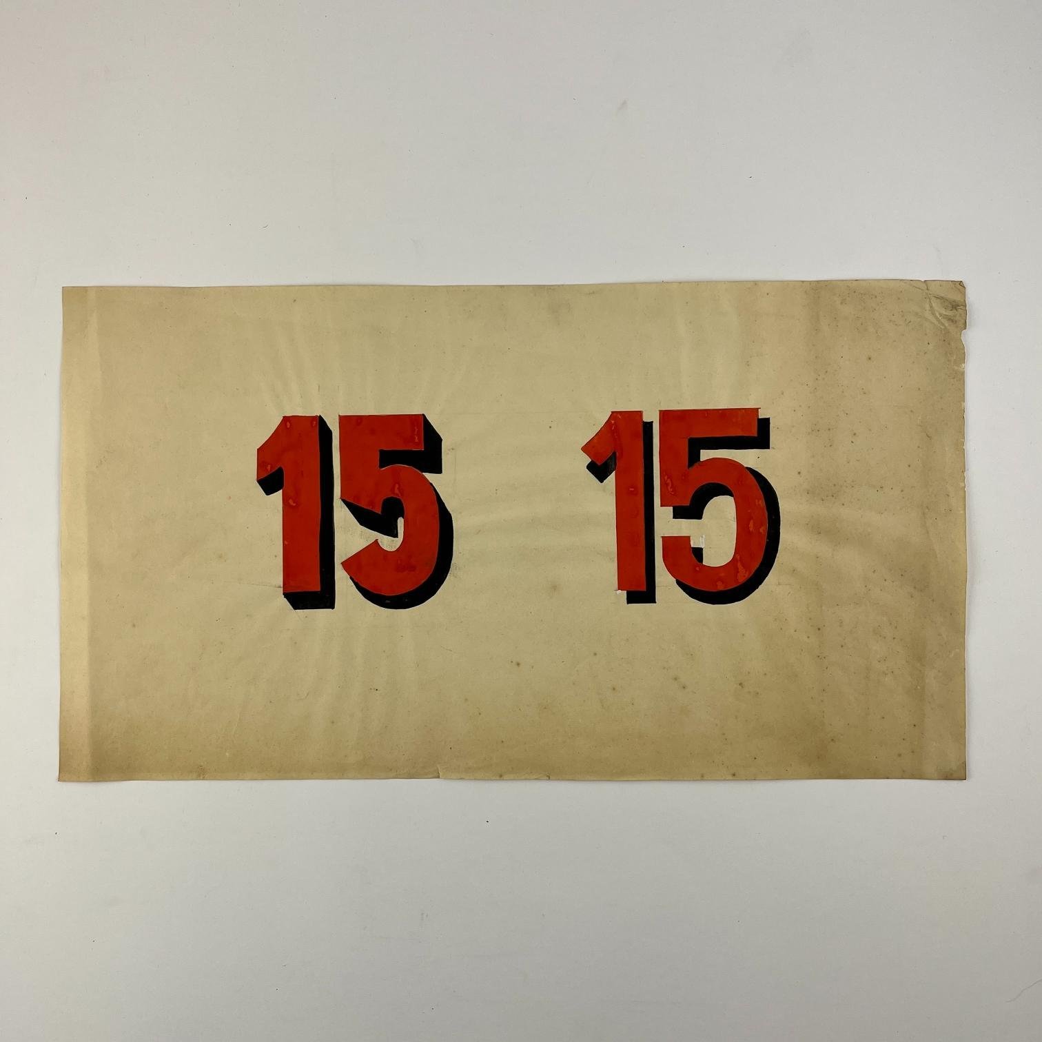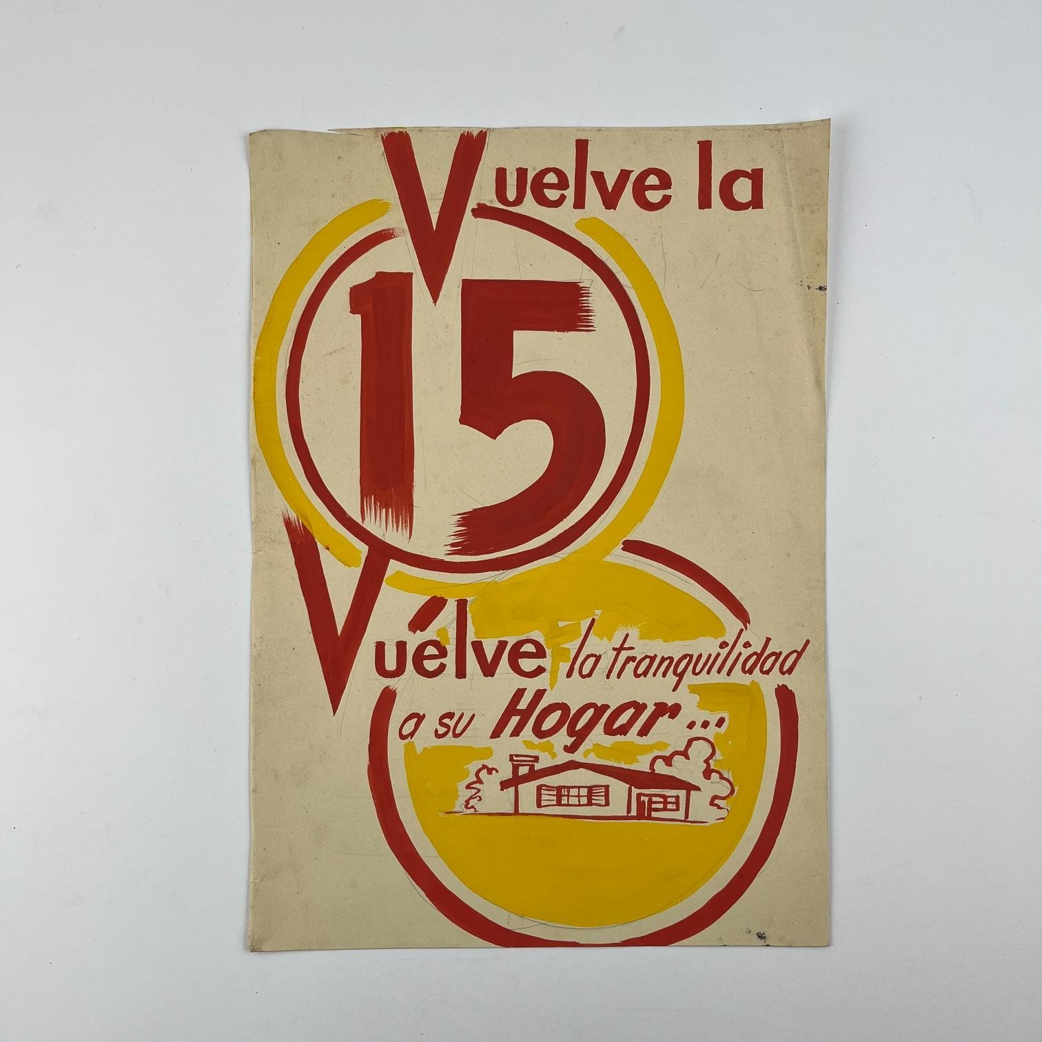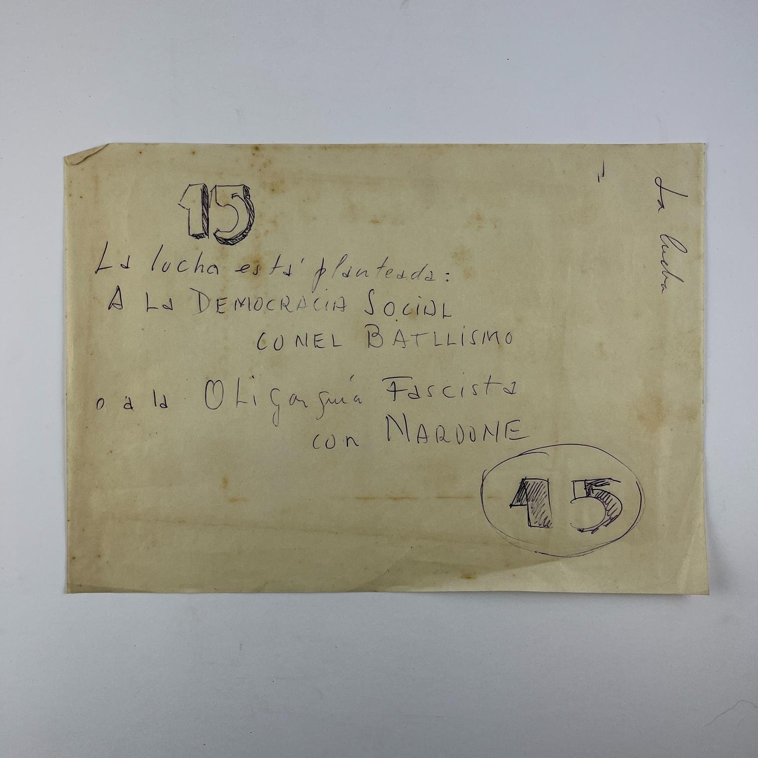 Cuatro bocetos de afiches electorales pertenecientes a la Lista 15 del Partido Colorado, en témpera sobre papel, en rojo y amarillo. 29 x 15 cm. Junto con dos hojas con distintas tipografías del número 15 y un texto para otro afiche, relativo a Benito Nardone.