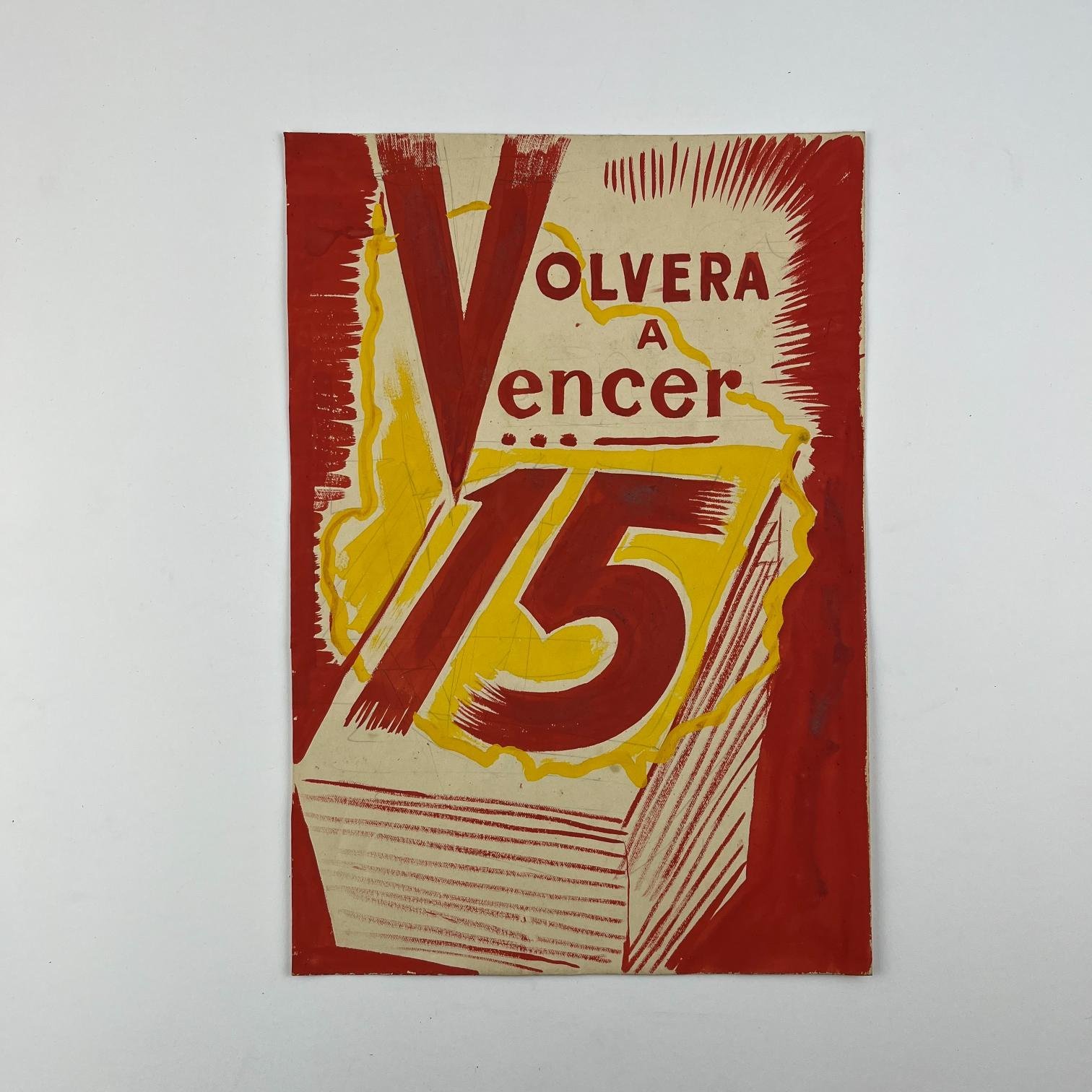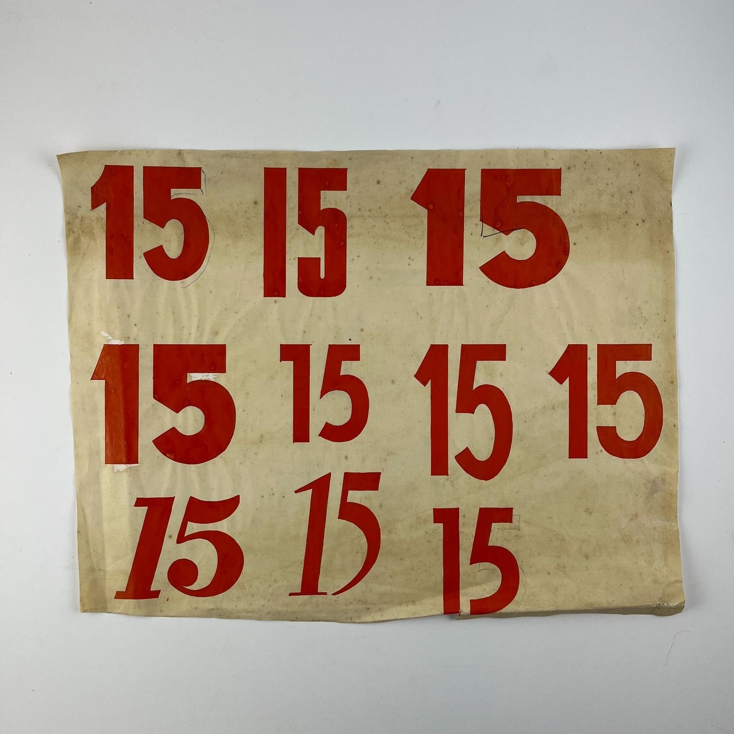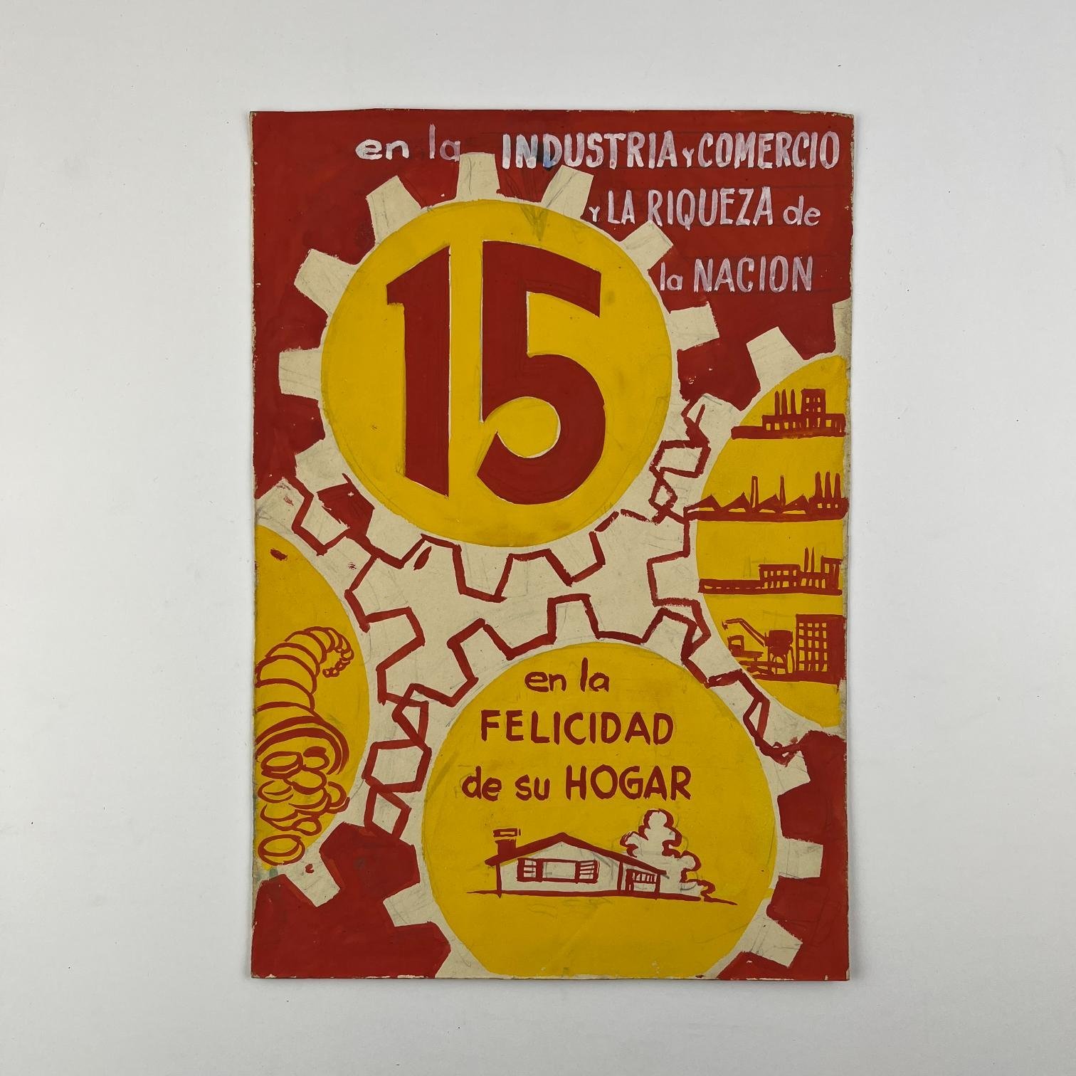 Cuatro bocetos de afiches electorales pertenecientes a la Lista 15 del Partido Colorado, en témpera sobre papel, en rojo y amarillo. 29 x 15 cm. Junto con dos hojas con distintas tipografías del número 15 y un texto para otro afiche, relativo a Benito Nardone.