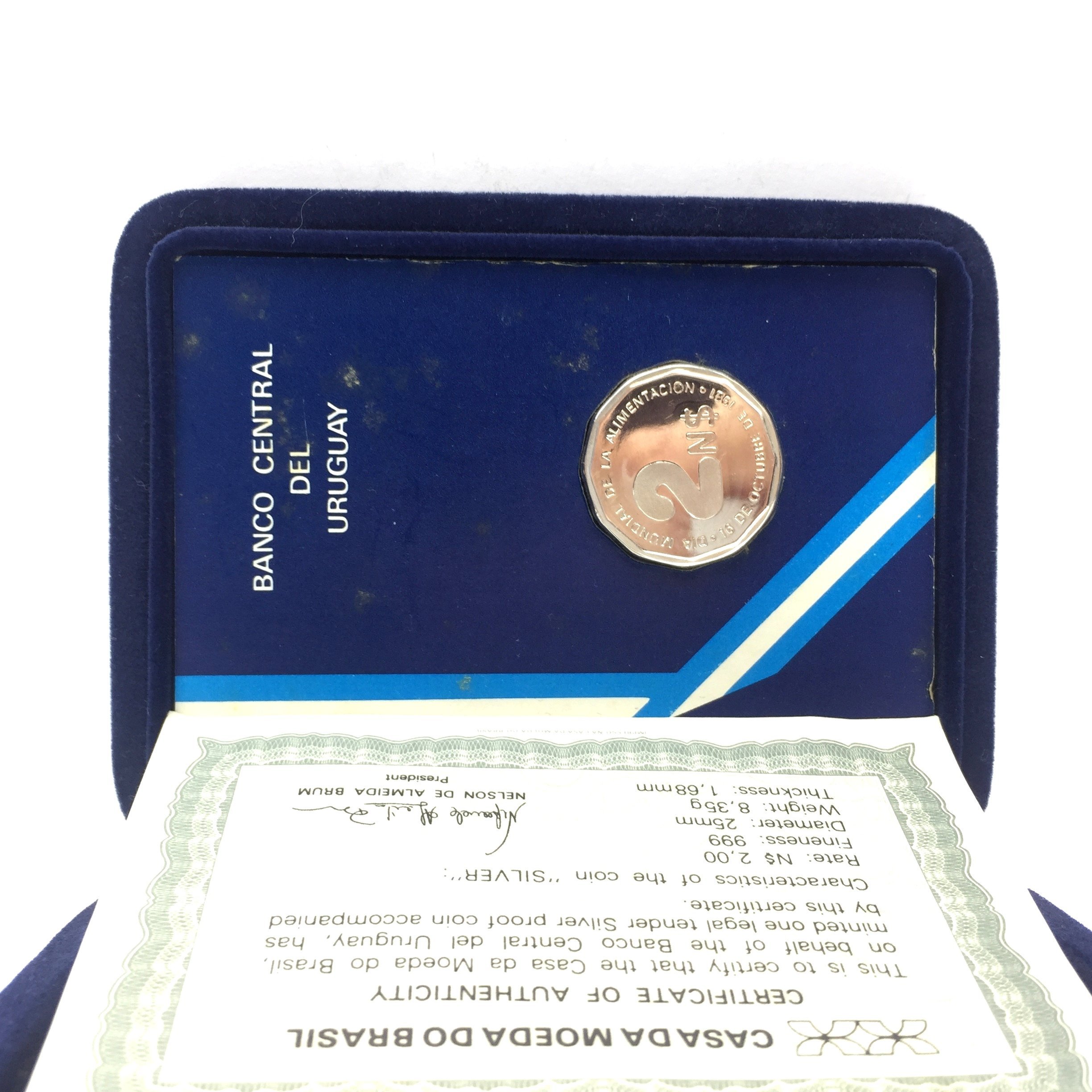 4 ensayos en plata uruguayos. 2 de 50 pesos año 1971, en perfecto estado y estuche original. 2 nuevos pesos año 1981, en perfecto estado y estuche original. 100 pesos año 1973, en iguales condiciones.