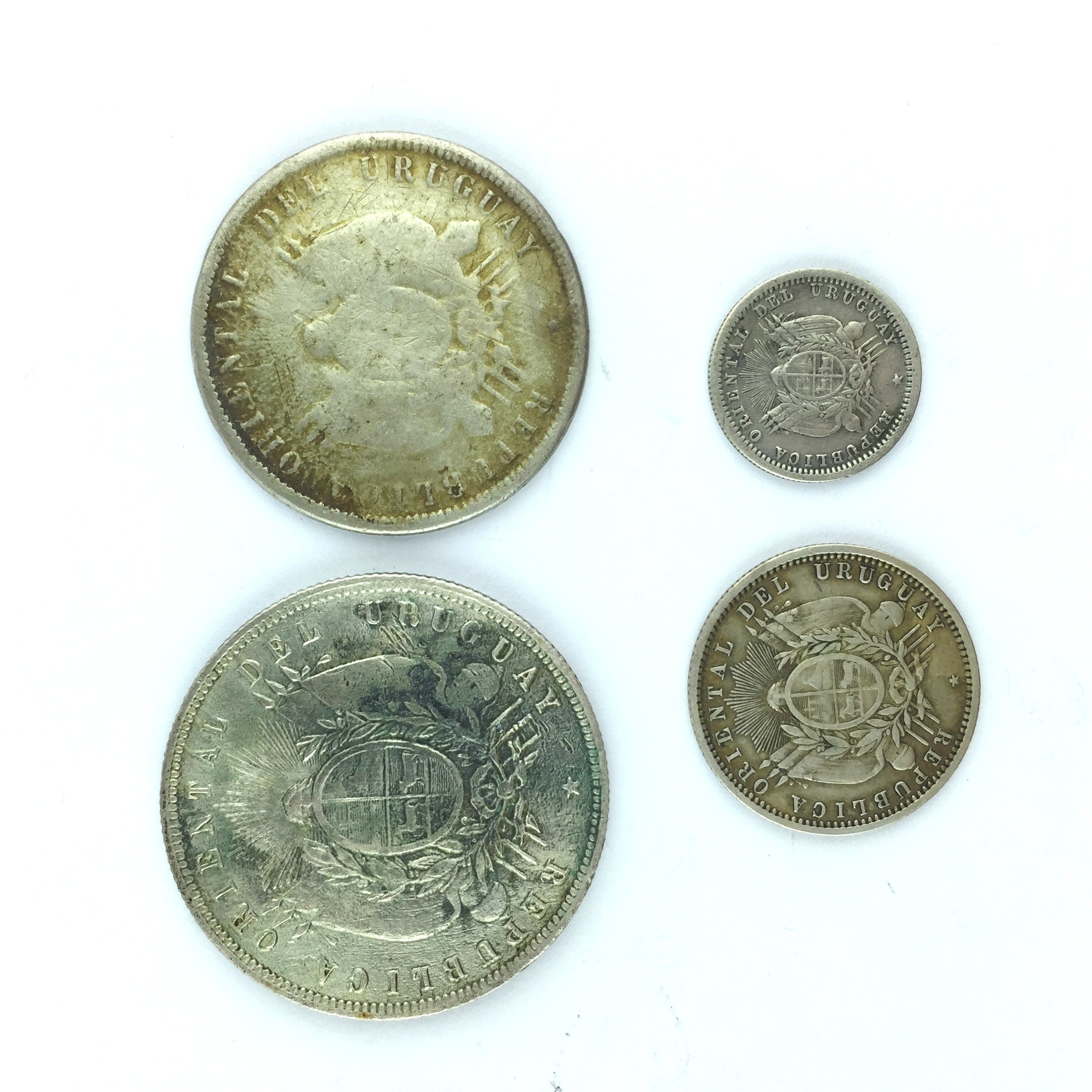4 monedas uruguayas en plata año 1877 denominación 1 peso, 50, 20 y 10 centésimos.