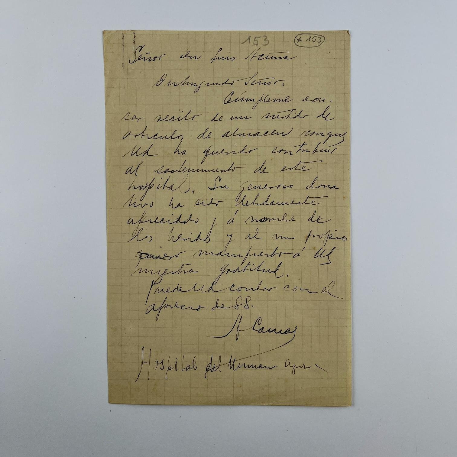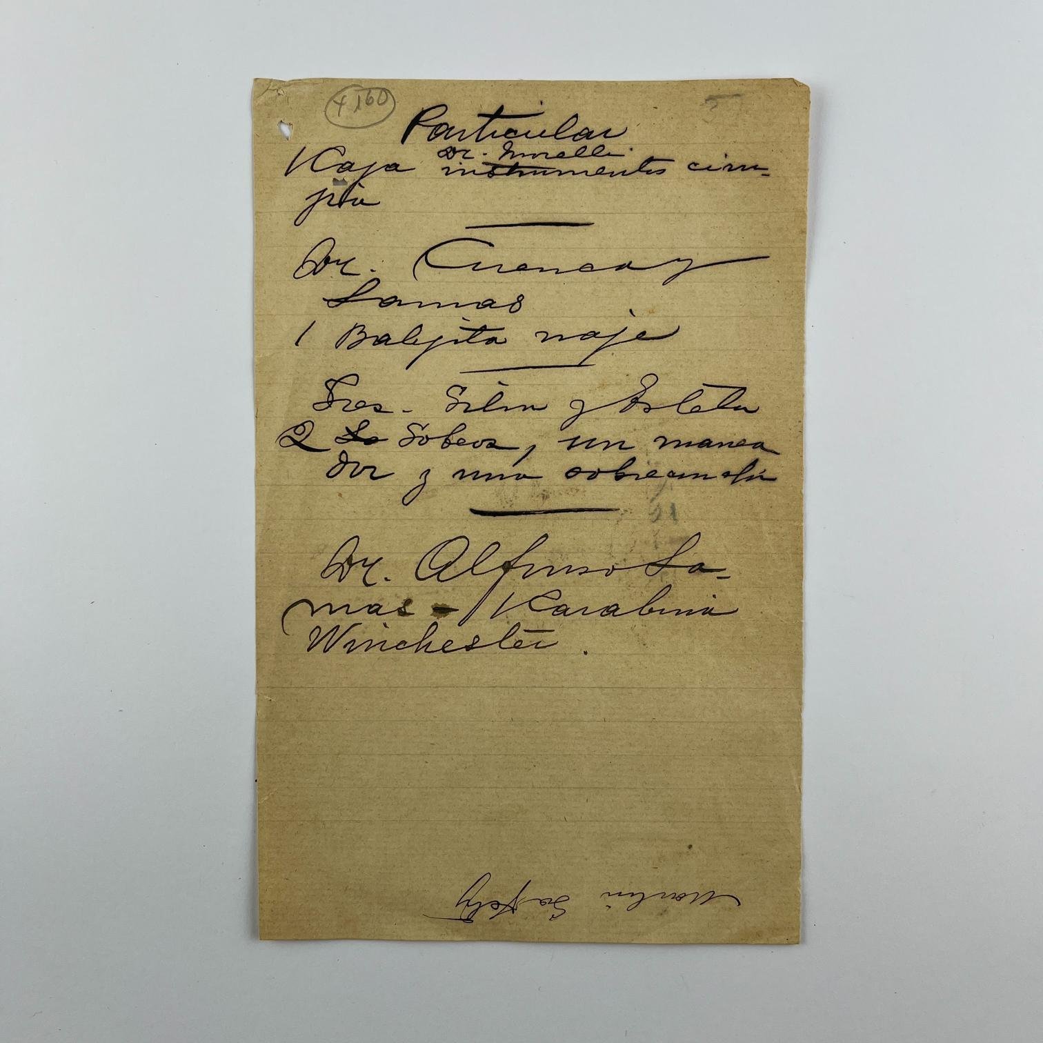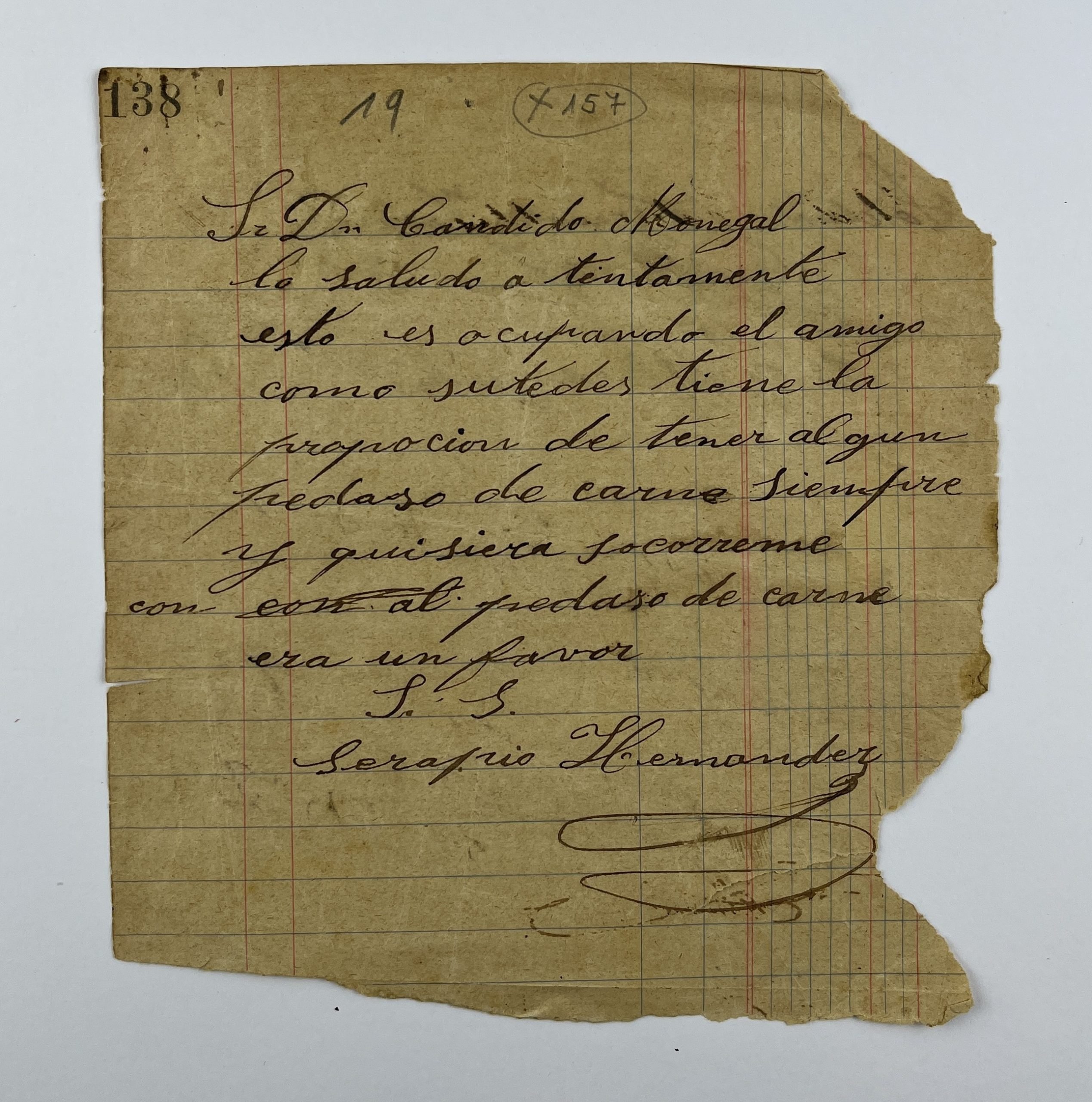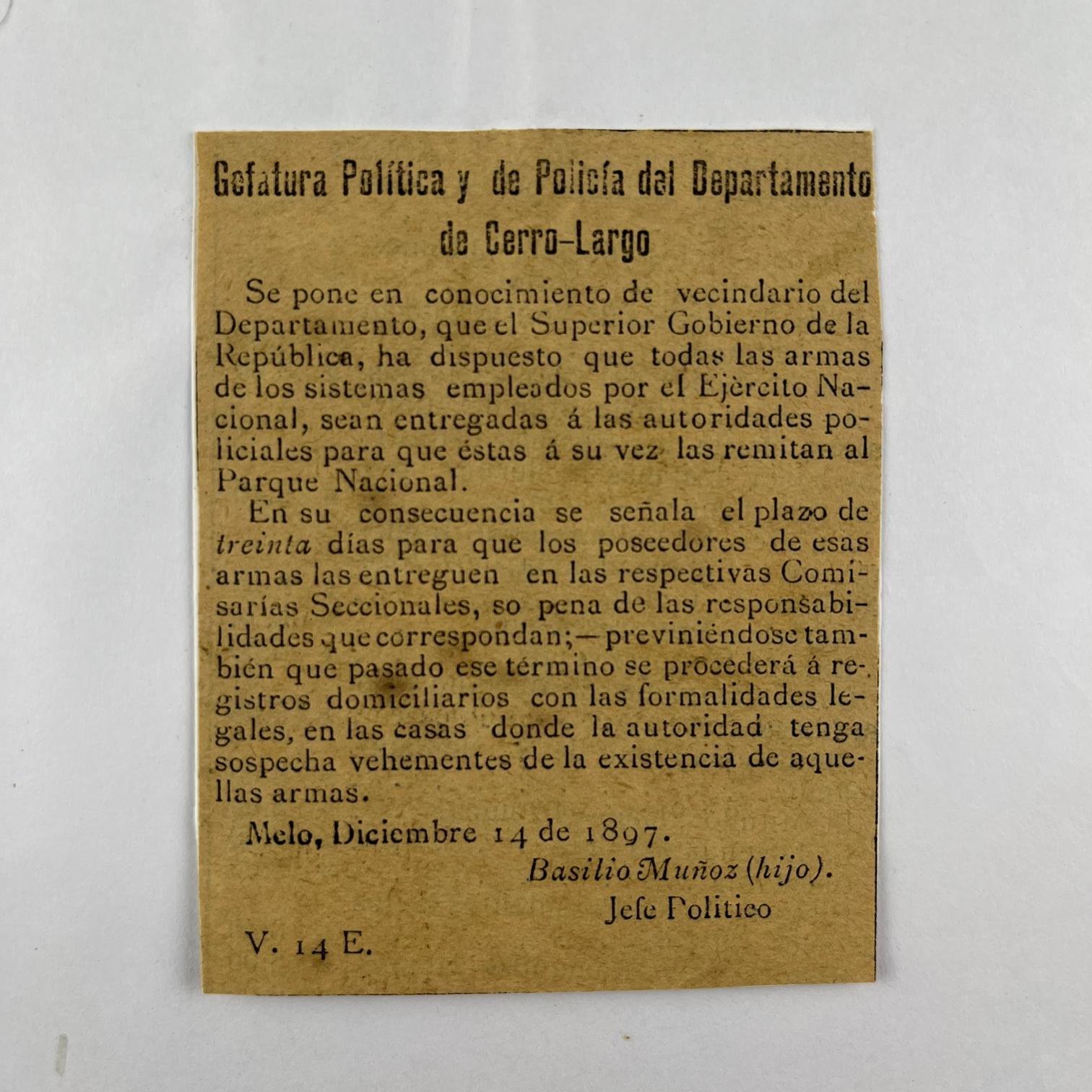 Seis piezas relativas a la revolución de 1897. Una carta manuscrita enviada a Cándido Monegal donde se le solicita «tabaco, arroz, fariña, y cuando pueda se lo pago, y balas, si tuviera, pues no tenemos»; otra en la que se le solicita «un pedazo de carne si quiere socorrerme»; otra enviada desde el hospital de sangre, donde se agradece «el surtido de artículos de almacén»; otra con el inventario de artículos recibidos, entre ellos «una carabina Winchester» y «una balijita de viaje»; un recorte de prensa con el anuncio emitido por Basilio Muñoz el 14 de diciembre en Melo, donde se informa que todas las armas empleadas por el ejército nacional deberán ser entregadas a las autoridades; una fotografía de Juan Ángel Golfarini, presidente de la Junta Revolucionaria.