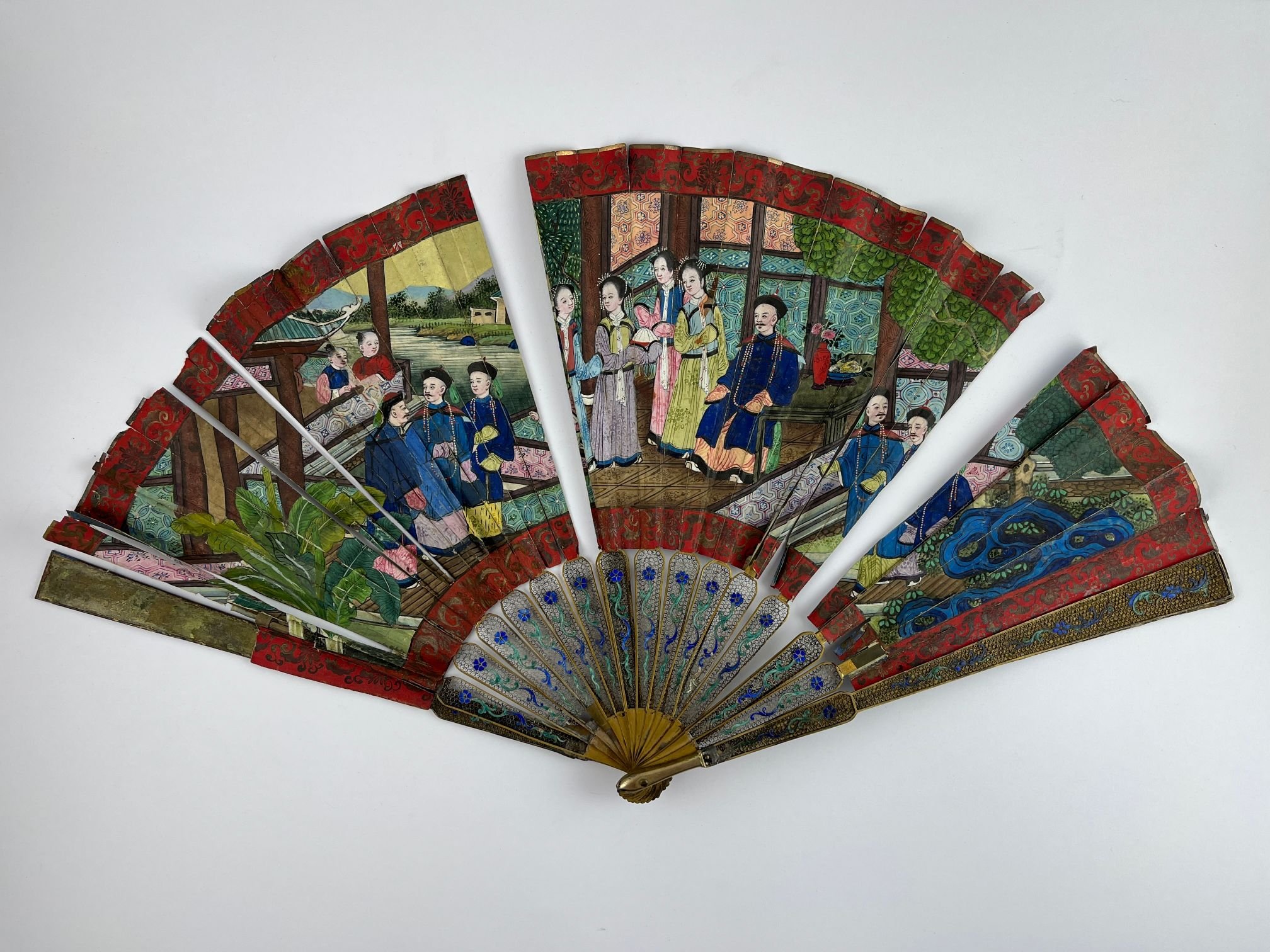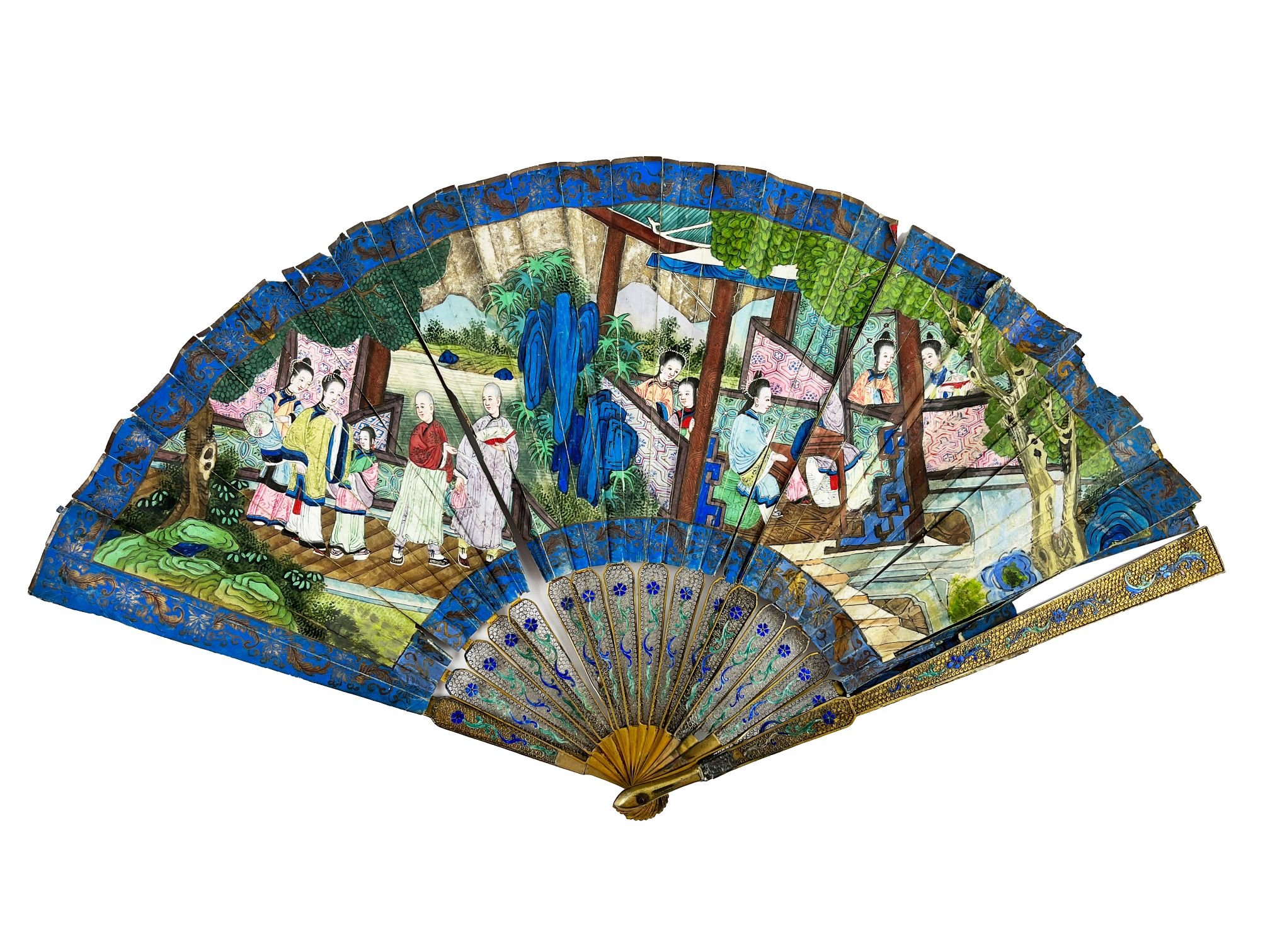 Abanico chino de diecisiete varillas en plata vermeil, filigrana y esmalte turquesa y azul, con país en papel pintado a mano «escenas típicas». Presenta averías y restauraciones.