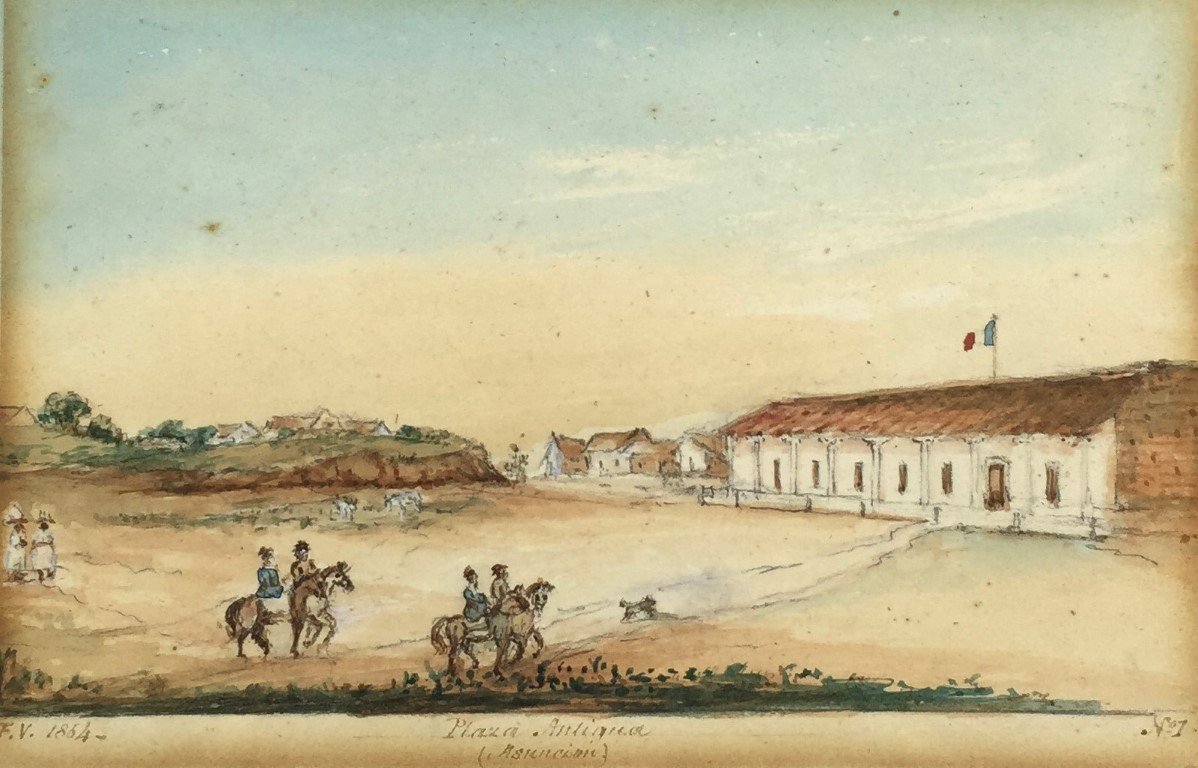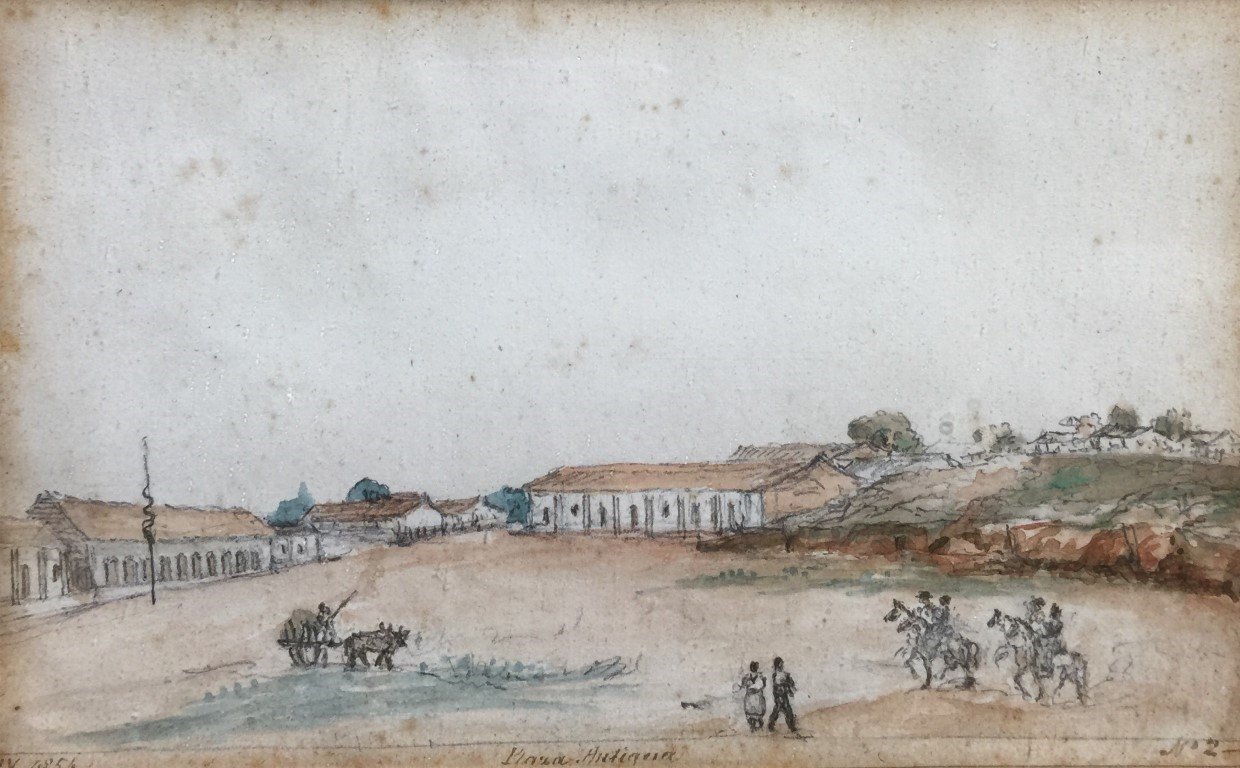 Par de acuarelas iconográficas paraguayas del siglo XIX, autor no identificado, firmadas «F.V.» y fechadas «1854». «Plaza Antigua (Asunción)», numerada «1», y «Plaza Antigua», numerada «2». 11.5 x 17 cm y 10.5 x 17 cm.