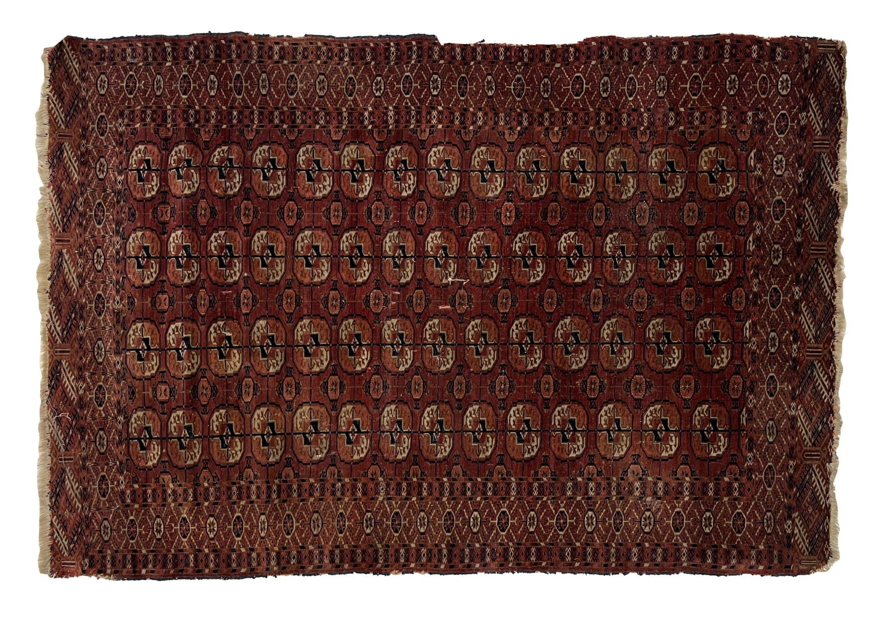 Alfombra Bukhara con decoración geométrica sobre fondo color bordeaux. Averías y desgastes. 170 x 113 cm.