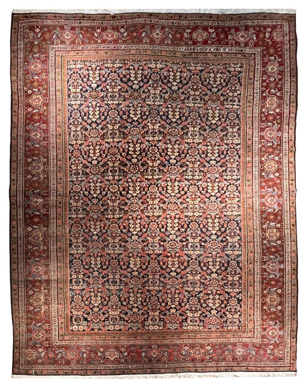 Alfombra persa con decoración geométrica floral en varios colores sobre fondo azul con guarda bordeuax. 405 x 314 cm.