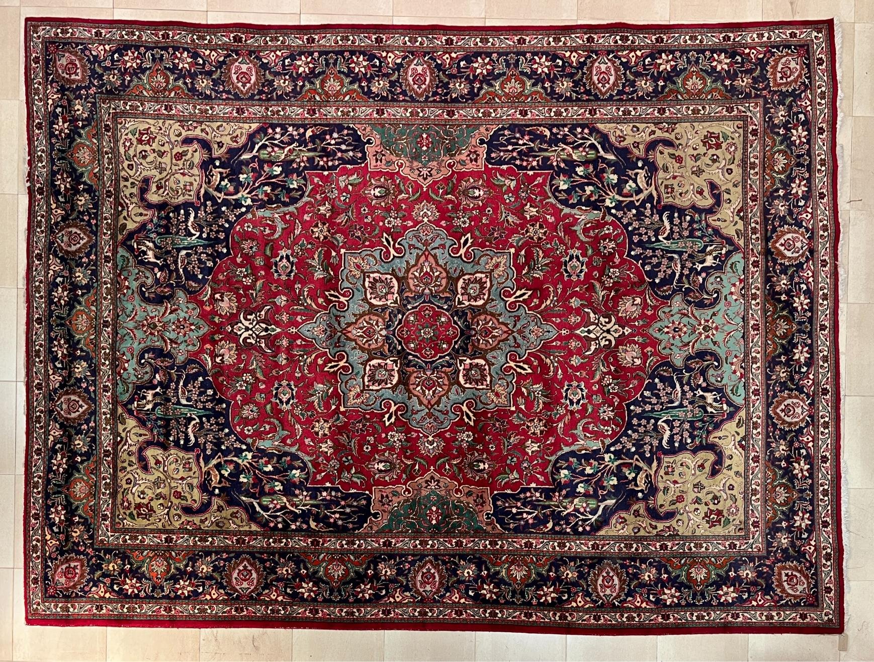 Alfombra persa con decoración floral y animal en varios colores sobre fondo azul. 505 x 300 cm.