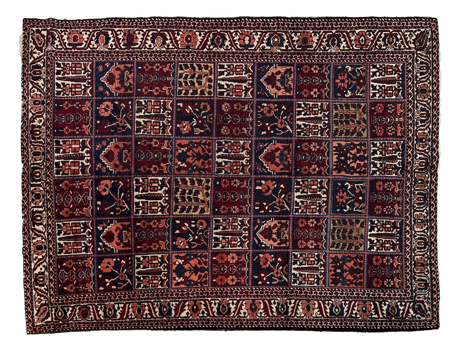 Alfombra persa con decoración geométrica floral en varios colores sobre fondo azul y bordeaux. 300 x 200 cm