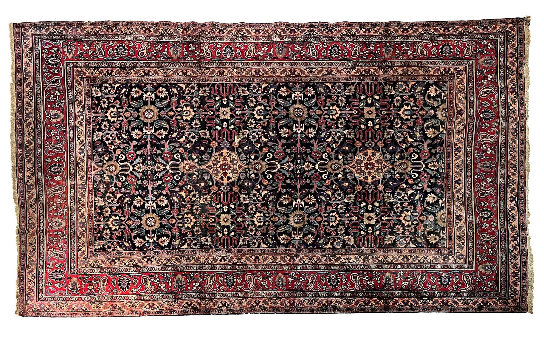 Alfombra persa con decoración geométrica floral en varios colores sobre fondo azul. 425 x 260 cm.
