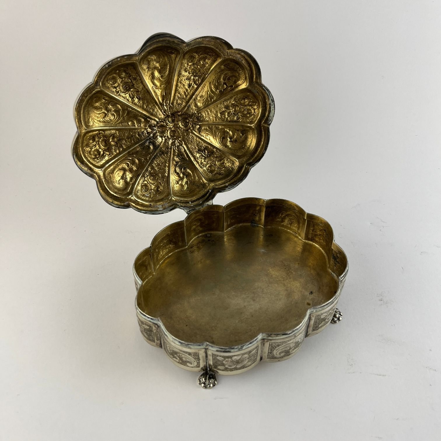 Alhajero alemán en plata cincelada «flores» con borde en ondas y cuatro patas esculturadas en forma de garra. 5.5 x 13.5 x 12 cm. Peso 335 gr.