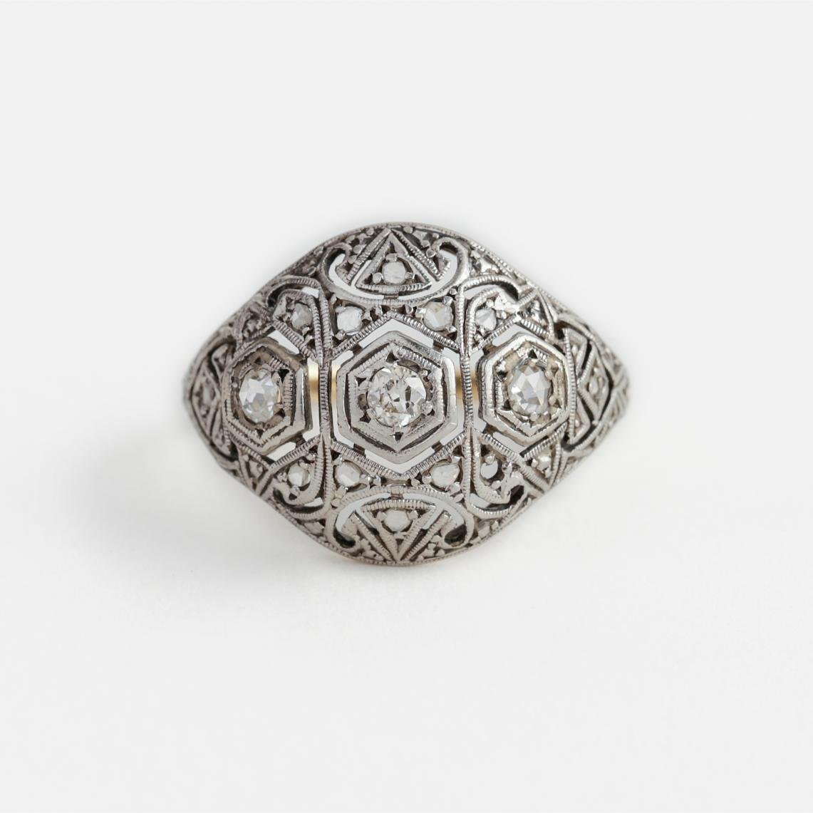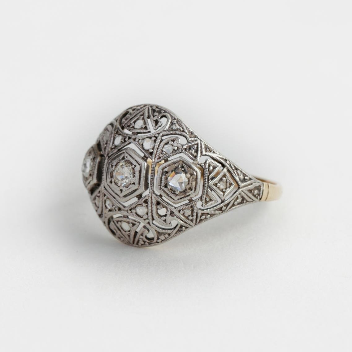 Anillo art decó en oro amarillo y blanco con tres pequeños brillantes y once diamantes, con espacio original para doce. Diámetro interno 18.5 mm. Peso bruto 3 gr.