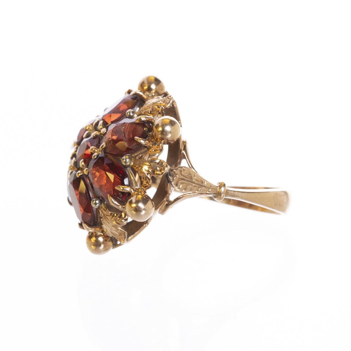 Anillo en oro 18 K amarillo esculturado en forma de flor, con siete granates (uno con cascadura). Diámetro interno 17 mm. Peso bruto 7,2 gr.
