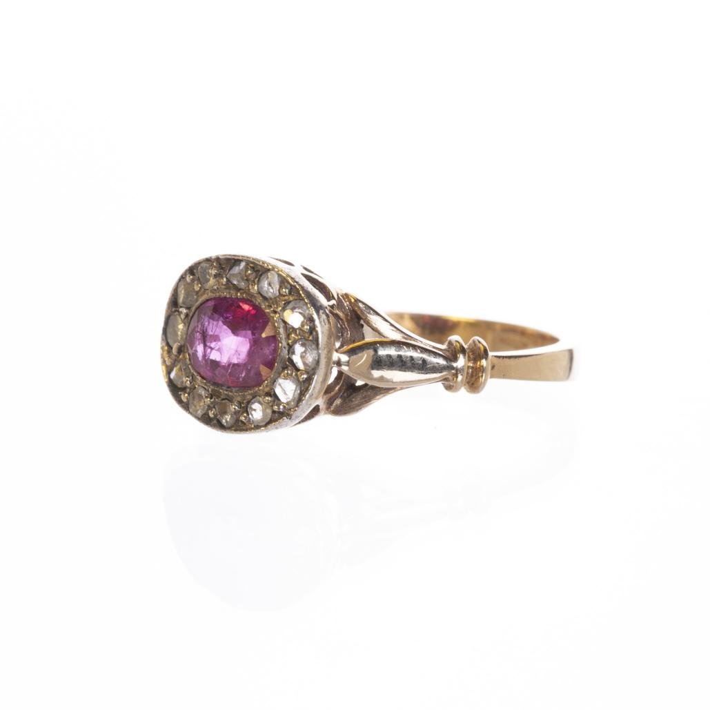 Anillo en oro 18 K amarillo con rubí central talla oval rodeado por doce diamantes. Diámetro interno 17 mm. Peso bruto 2,4 gr.