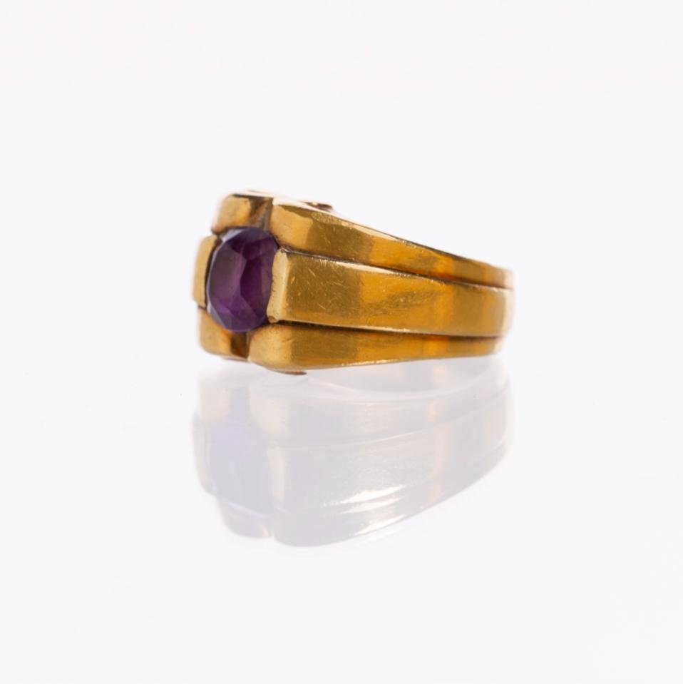 Anillo en oro 18 K amarillo con amatista central talla oval. Diámetro interno 16 mm. Peso bruto 14 gr.