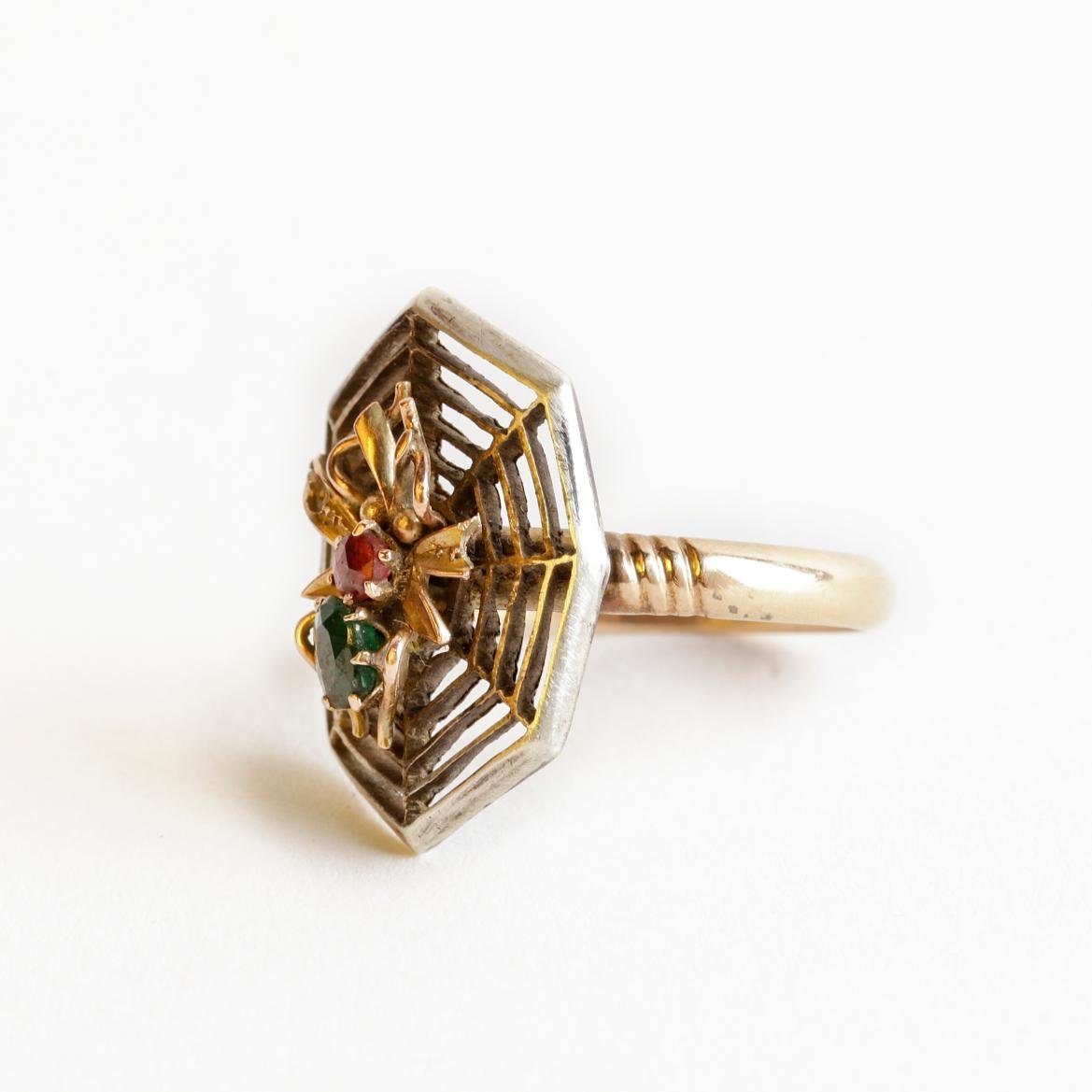 Anillo en oro amarillo y blanco esculturado «avispa en telaraña», con una pequeña esmeralda y un pequeño rubí. Pequeña avería en ala de avispa. Diámetro interno 17 mm. Peso bruto 3.8 gr.