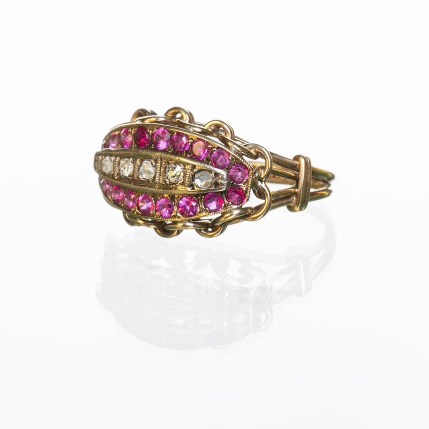 Anillo años cuarenta en oro 18 K amarillo con cinco diamantes y dieciocho rubíes. Diámetro interno 18 mm. Peso bruto 4,4 gr.