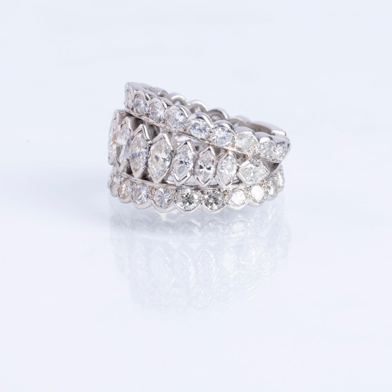 Anillo en oro 18 K blanco con veintiocho diamantes talla brillante y trece diamantes talla navette. Diámetro interno 16 mm. Peso bruto 10 gr.