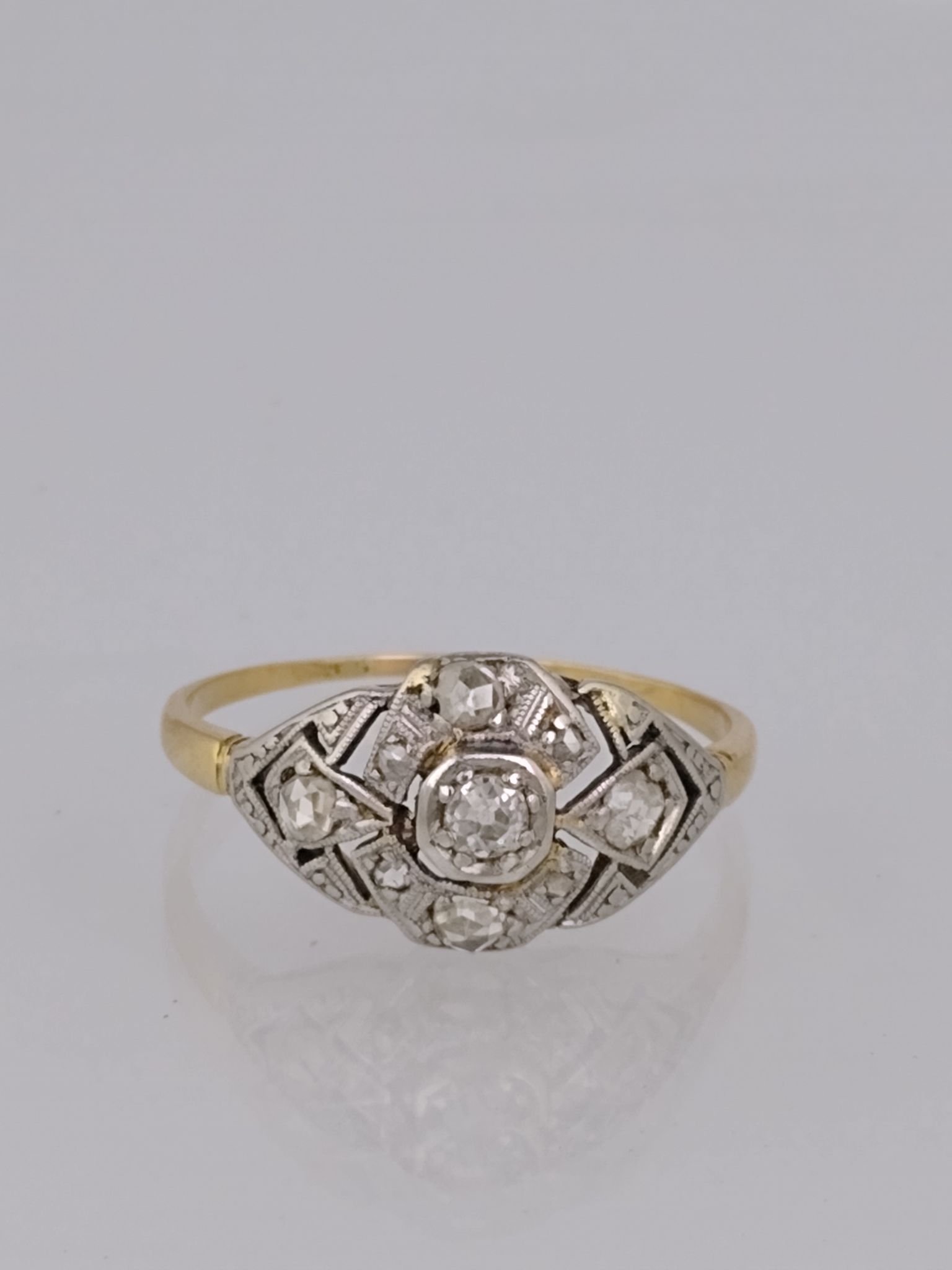 Anillo art decó en oro 18 K amarillo y blanco con pequeño brillante central y ocho diamantes. Peso bruto 1.7 gr.