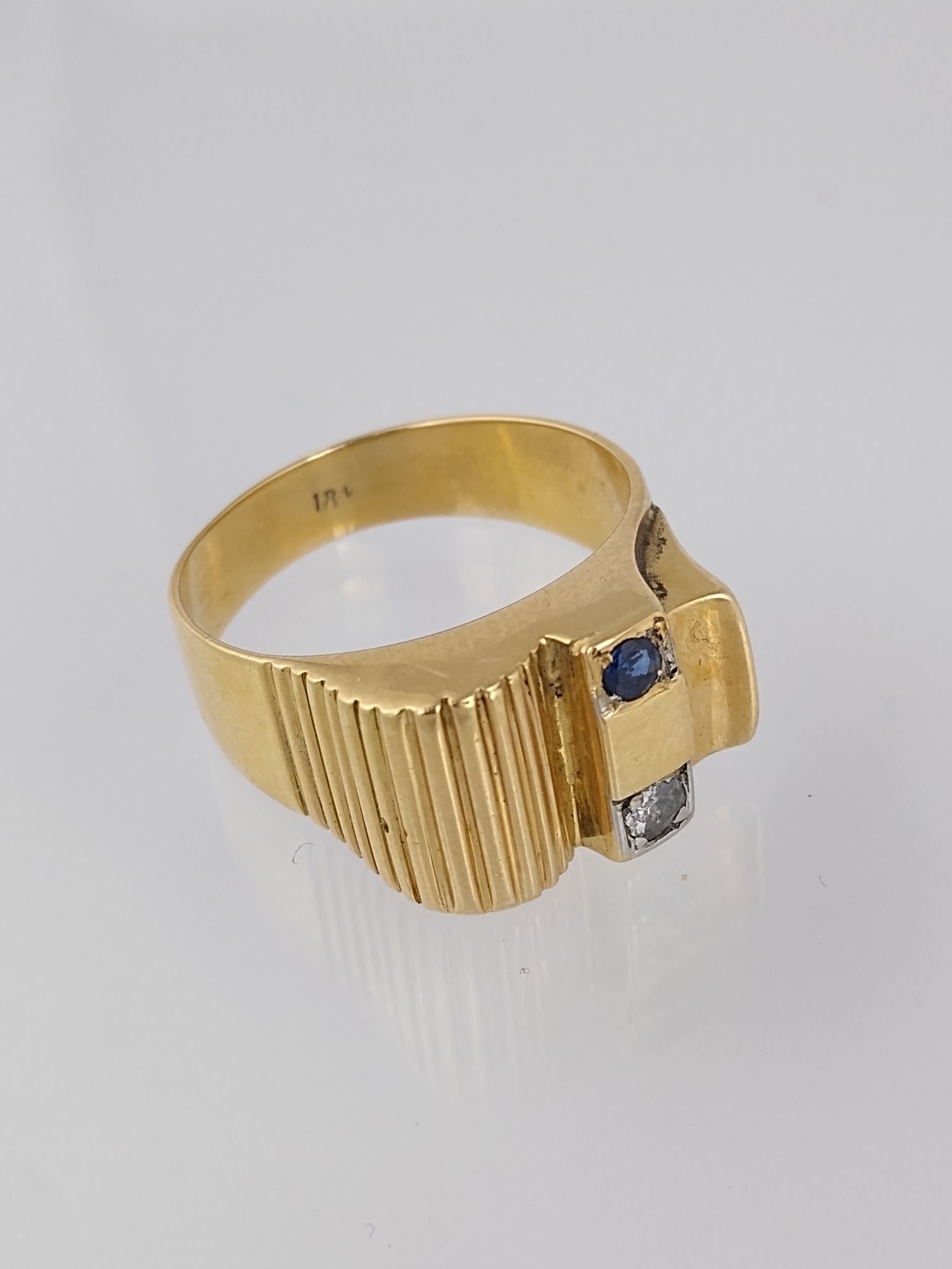 Anillo chevalier en oro 18 K amarillo con pequeño brillante y zafiro talla redonda. Peso bruto 7 gr.