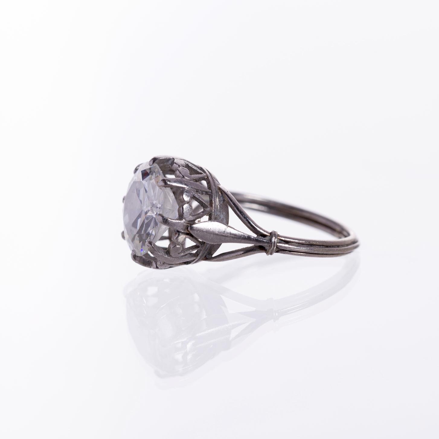 Anillo solitario en oro 18 K blanco con diamante talla brillante de 2,5 ct aprox. (9,3 x 4,95 mm). Diámetro interno 16 mm. Peso bruto 3,8 gr.
