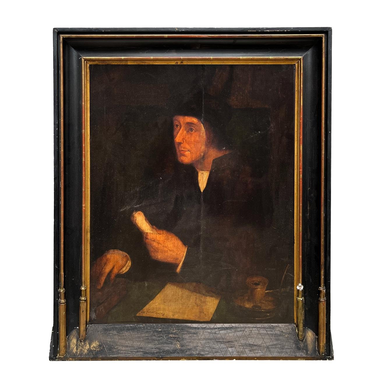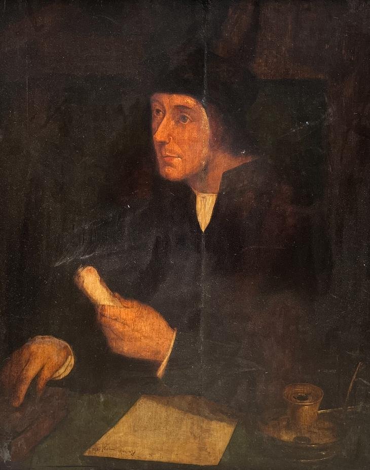 Anónimo europeo de escuela renacentista nórdica Óleo sobre tabla de nogal «Retrato de caballero» C. 1500 72 x 56 cm Presenta antigua restauración en tabla