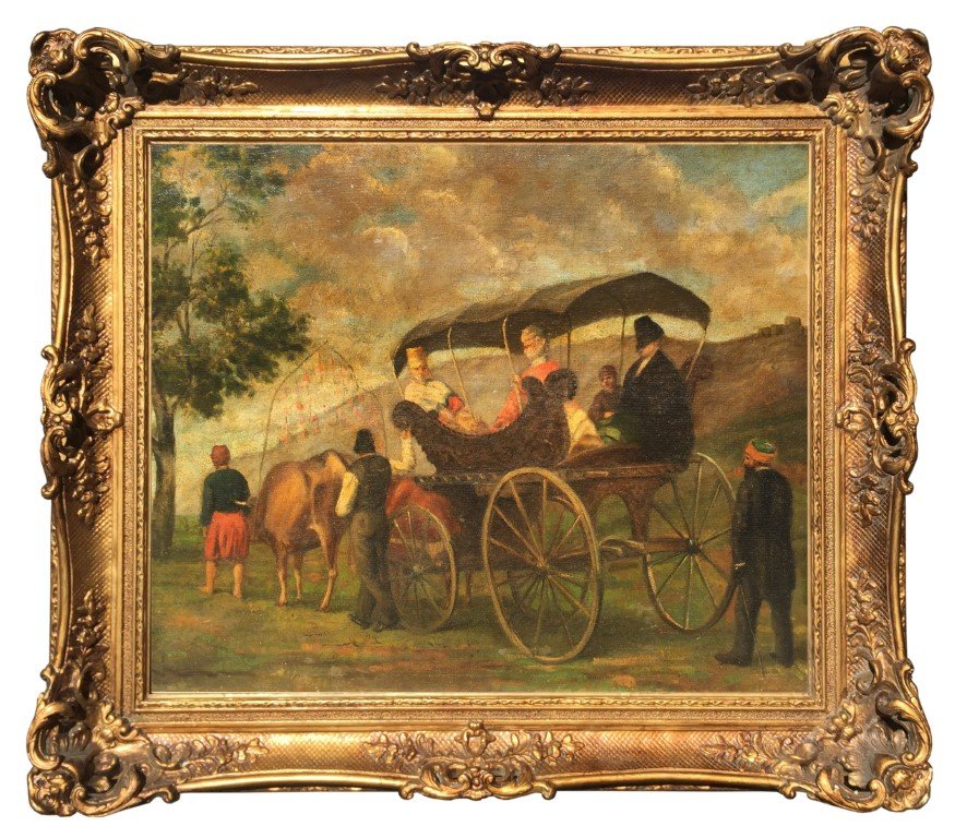 Anónimo europeo (siglo XIX). Óleo sobre tela. «Paseo turco en carruaje.» 56 x 73 cm.