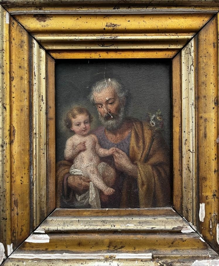 Anónimo europeo s. XIX Óleo sobre tabla «San José y Niño Jesús» 19 x 15.5 cm
