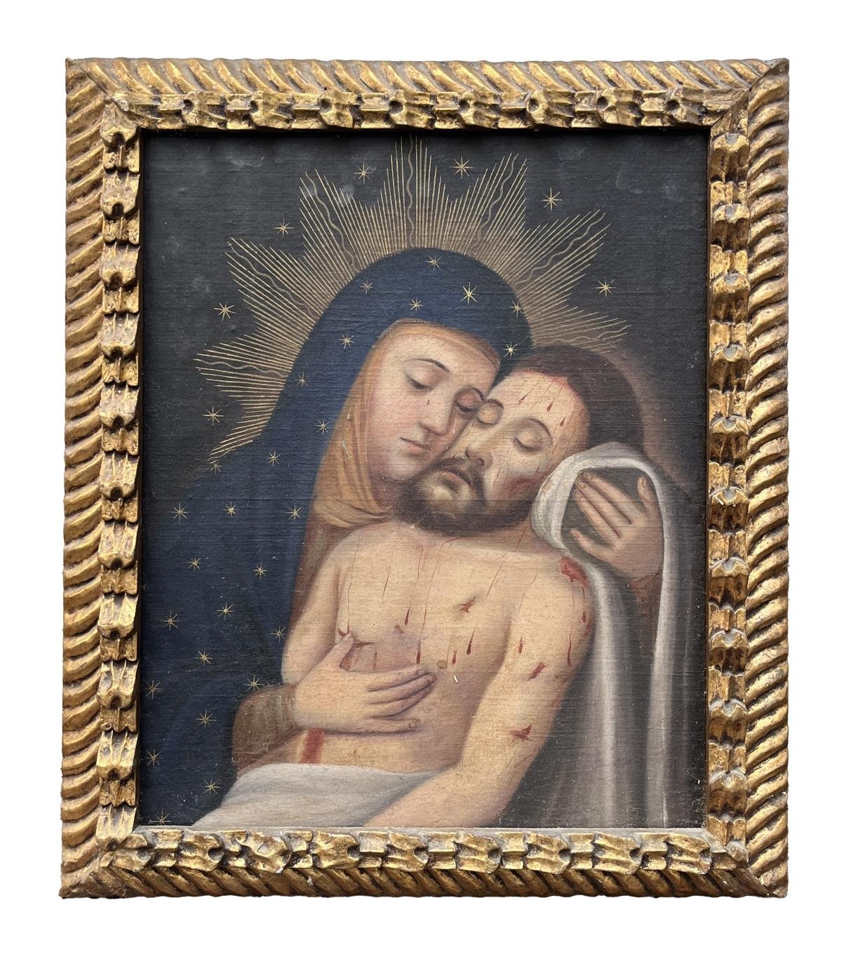 Anónimo hispanoamericano s XIX. Óleo sobre tela pegada en tabla. 39 x 32 cm. «La Piedad.» Presentado en marco de madera tallada y dorada.