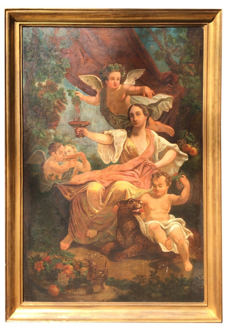 Anónimo (escuela italiana, siglo XIX). «Alegoría de la vendimia.» Óleo sobre tela. 147 x 98 cm. Reentelado.