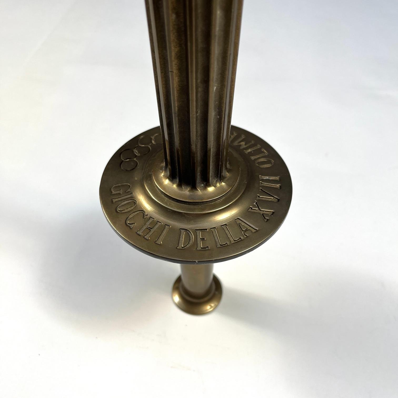 Antorcha olímpica en aluminio color bronce perteneciente a los Juegos Olímpicos celebrados en Roma en el año 1960, con inscripción «Ghiochi della XVII Olimpiada. Diseño Amedeo Mauri. Marca del fabricante M.F. Curtisa, Bologna. Numerada 457. Largo 39,5 cm. Número de portadores de la antorcha: Un total de 1.529: 330 en Grecia, 1.199 en Italia
