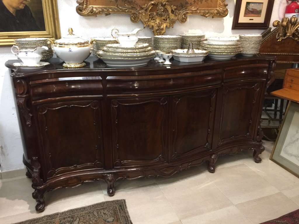 Aparador estilo victoriano enchapado en pluma de caoba. Tres cajones y cuatro puertas. 104 x 300 x 60 cm.