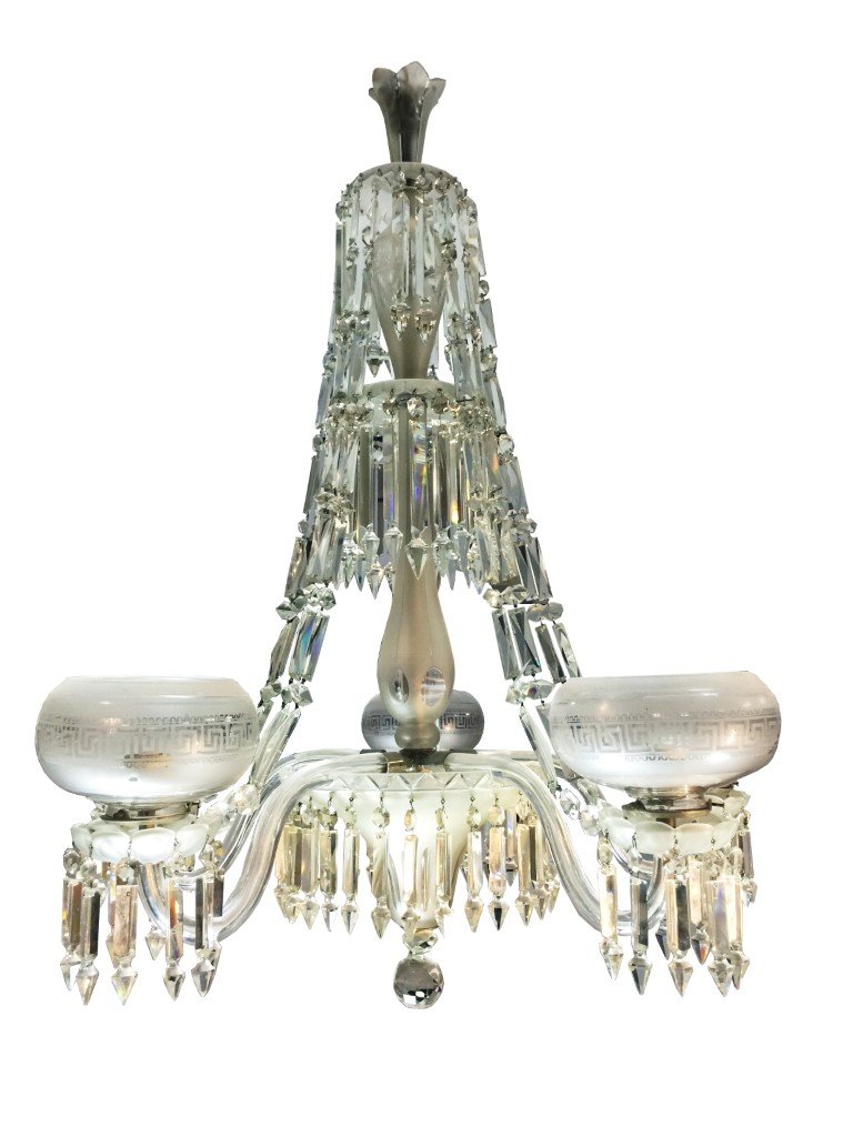 Araña colonial, cinco luces, en cristal. Lanzas y caireles facetados, fanales tallados al ácido con guarda griega. 110 x 90 cm.