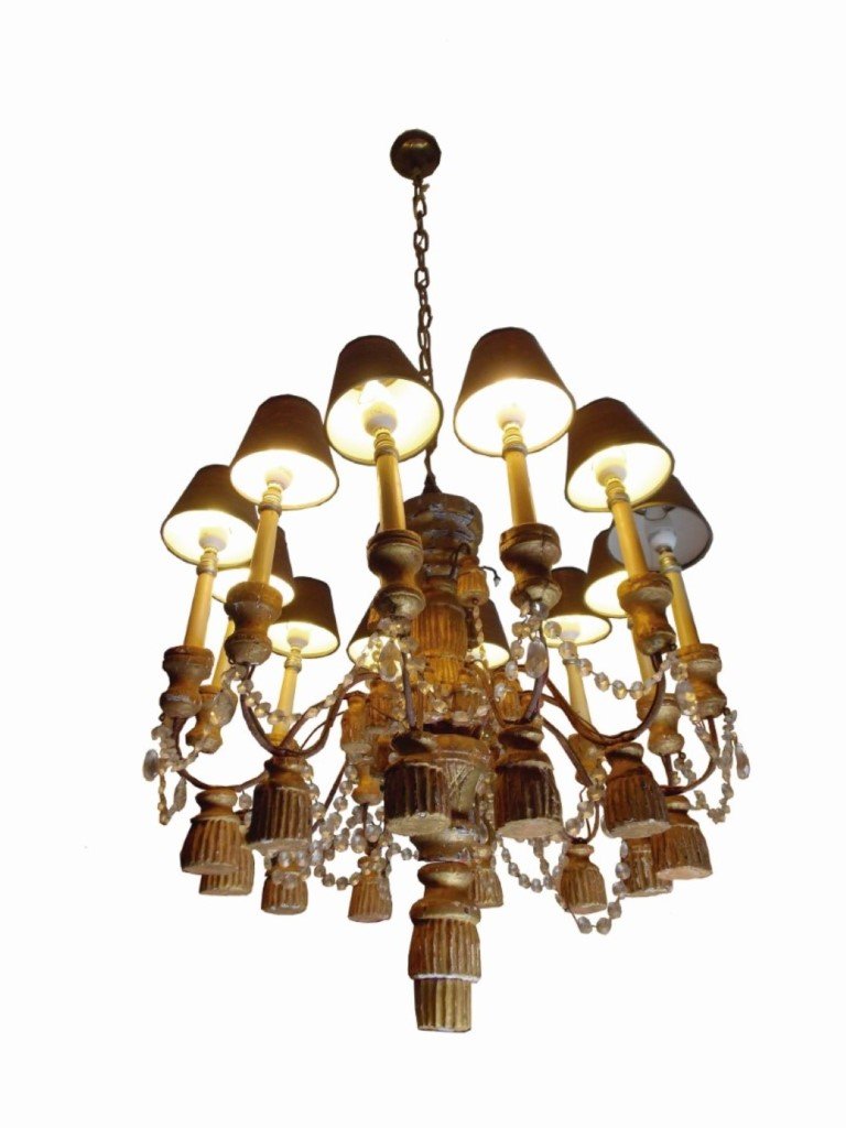 Araña veneciana, doce luces, en madera tallada y dorada. Brazos en hierro forjado, decorados con cuentas de cristal. Electrificado, originalmente para velas. 70 x 70 cm.