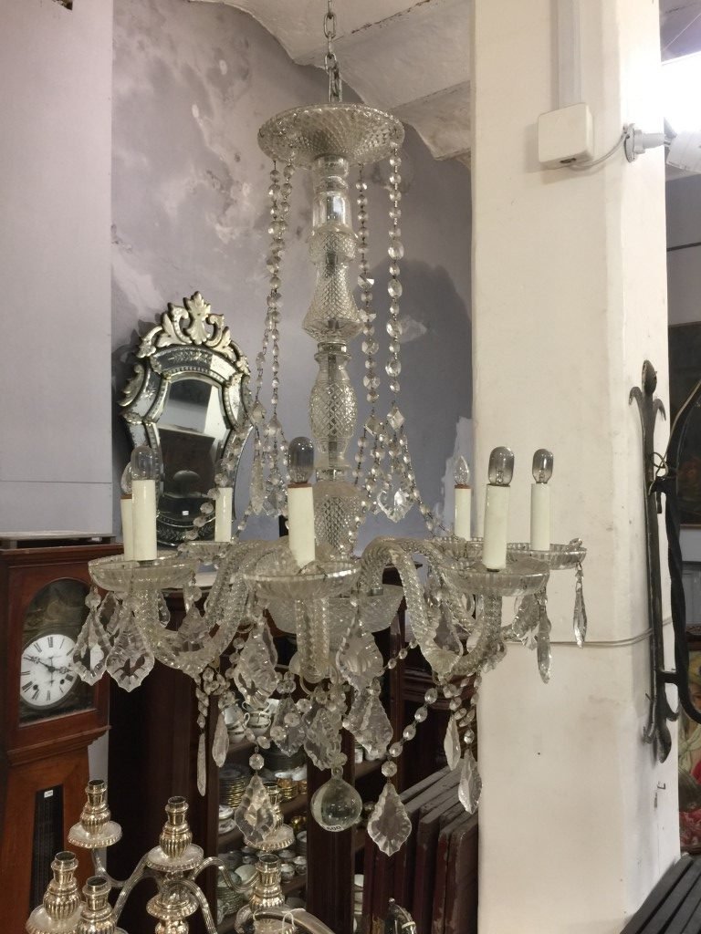 Araña ocho luces en cristal con brazos torneados, columna y platos tallados, decorada con cuentas y caireles. Bombas Pase Mignon. 80 x 50 cm.