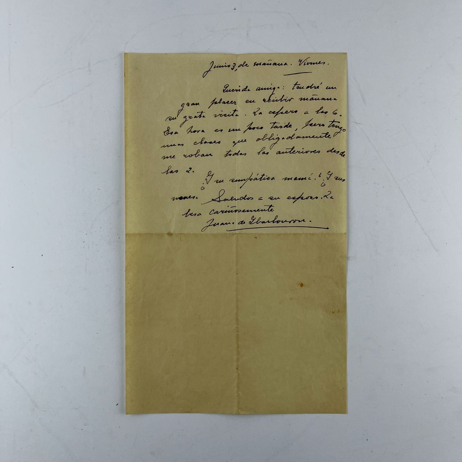 Archivo Jiménez de Aréchaga. Dos álbumes de visitas, uno perteneciente a Esther Sienra de Jiménez de Aréchaga y otro a su hija, Esther Jiménez de Aréchaga Sienra, con textos y poesías firmados por Esther de Cáceres, Juana de Ibarbourou, Fernán Silva Vadés, José Cuneo, Carlos Rodríguez Pintos, Emilio Oribe, Margarita Abella Caprile, Raimundo Rivas, Elías Regules, Raúl Montero Bustamante, José María Fernández Saldaña y Daniel Martínez Vigil, entre otros. Encuadernados en cuero, uno averiado. Conjunto de 22 cartas y notas enviadas a Esther Sienra de Jiménez de Aréchaga por Juana de Ibarbourou, una fotografía y dos recortes de prensa. Conjunto de 17 cartas y cartas de visita enviadas a Esteher Sienra de Jiménez de Aréchaga enviadas por Juana de Ibarbourou y una enviada por su marido a Eduardo Jiménez de Aréchaga Vargas bordo del R.M.S.P. Almanzora, fechada en marzo de 1922.