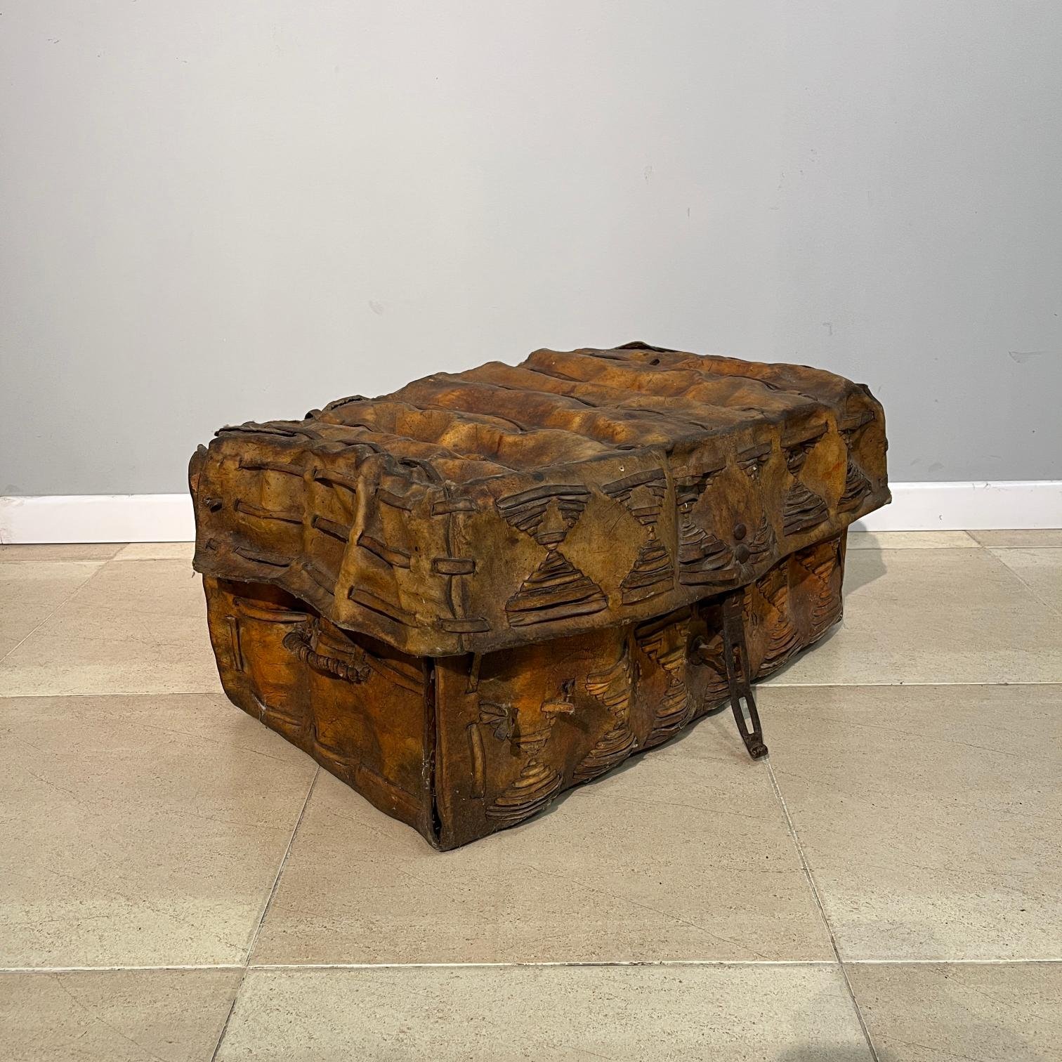 Arcón andino tipo petaca, en cuero crudo con armazón en madera y decoración geométrica en tiras de cuero. Cerradura en hierro forjado. 35 x 70 x 45 cm.