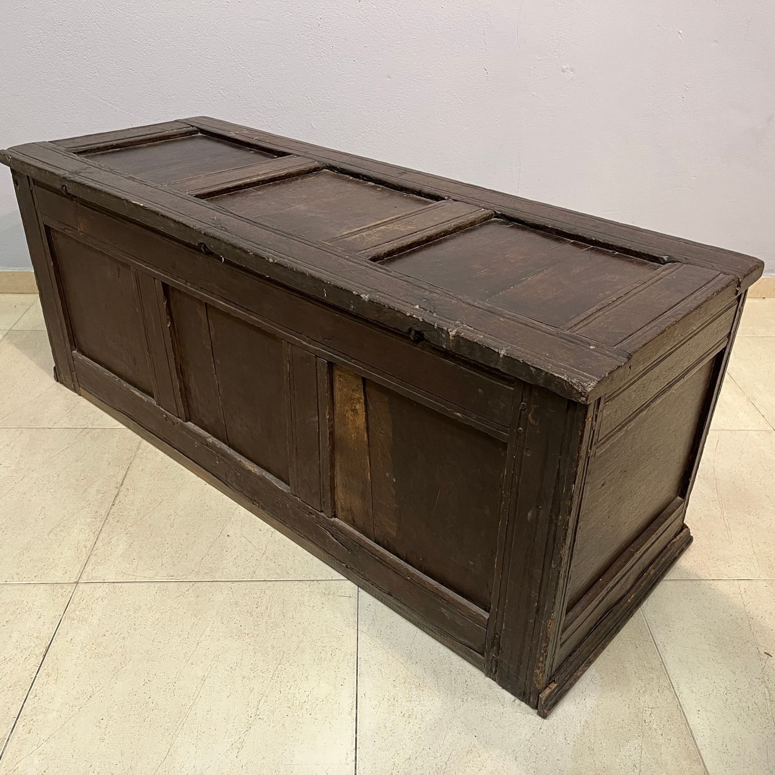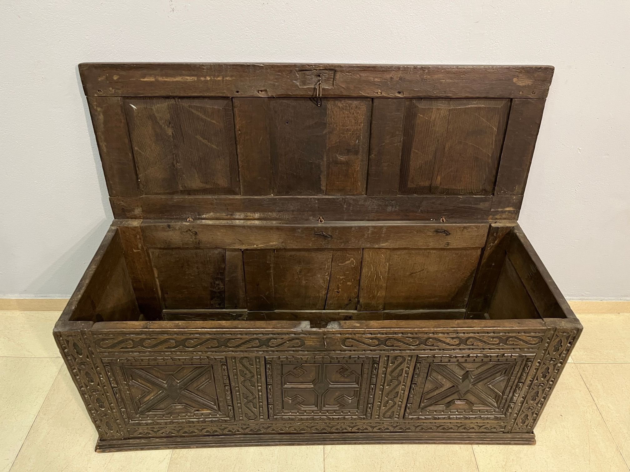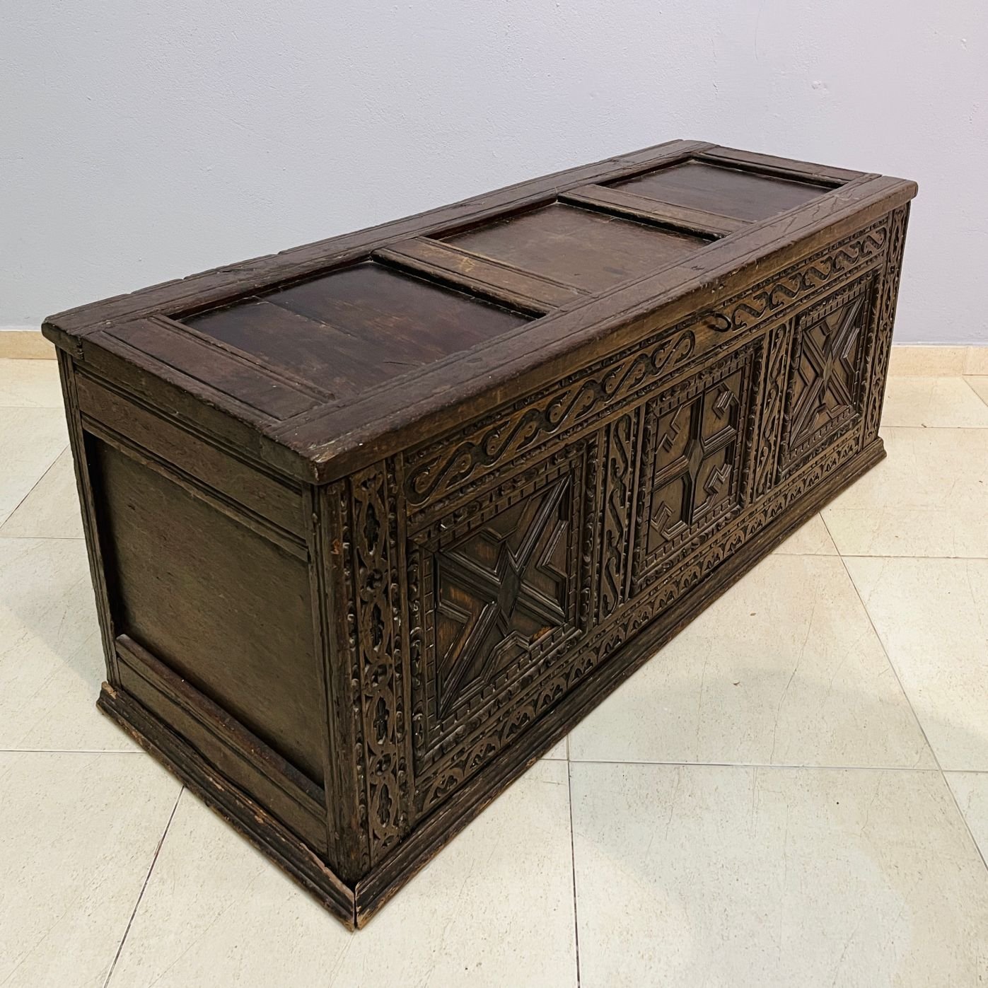 Arcón inglés s. XVIII en madera tarugada, con frente tallado. 55 x 133 x 50 cm.