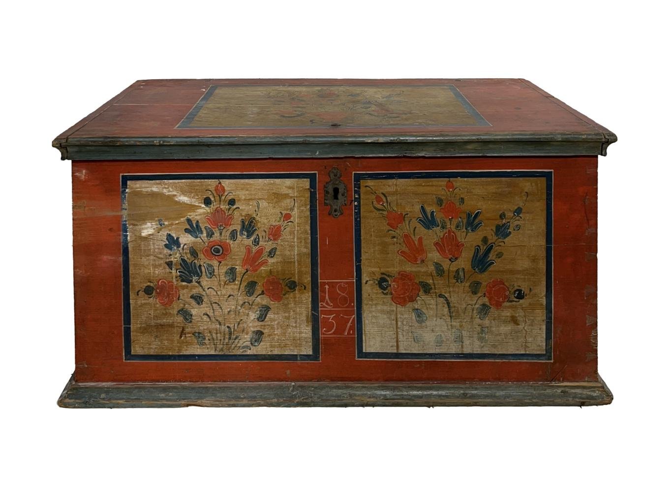 Arcón tirolés s. XIX en madera encastrada y tarugada, patinada y pintada «flores», fechado «1837». Bocallave en hojalata. 54 x 108 x 64 cm. Pequeñas averías y desgastes.