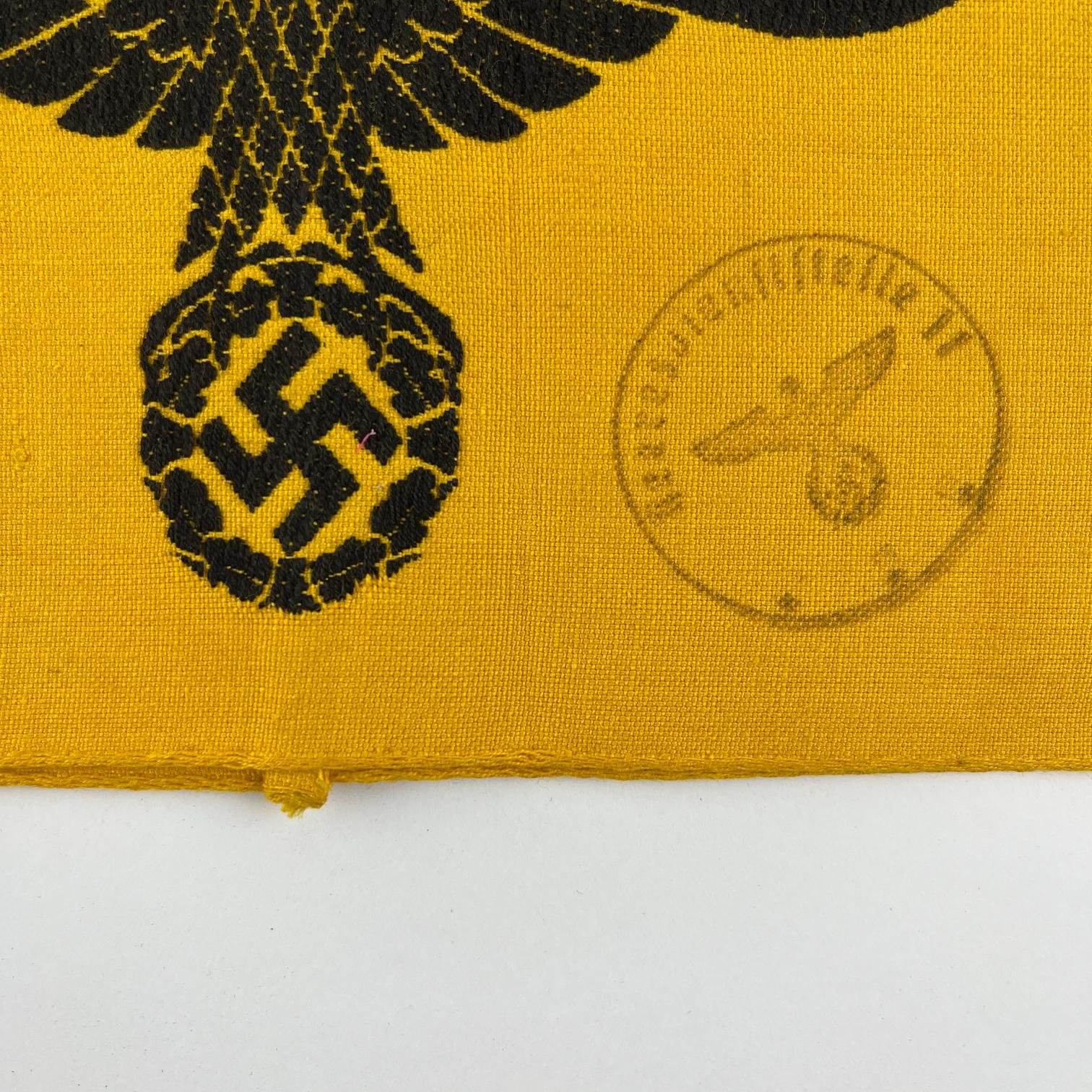 Brazalete o “armelbinde” alemán época nacionalsocialista para el servicio civil, en tela de algodón amarilla con águila y esvástica bordadas en hilo negro y sello en tinta. 38 x 10 cm.