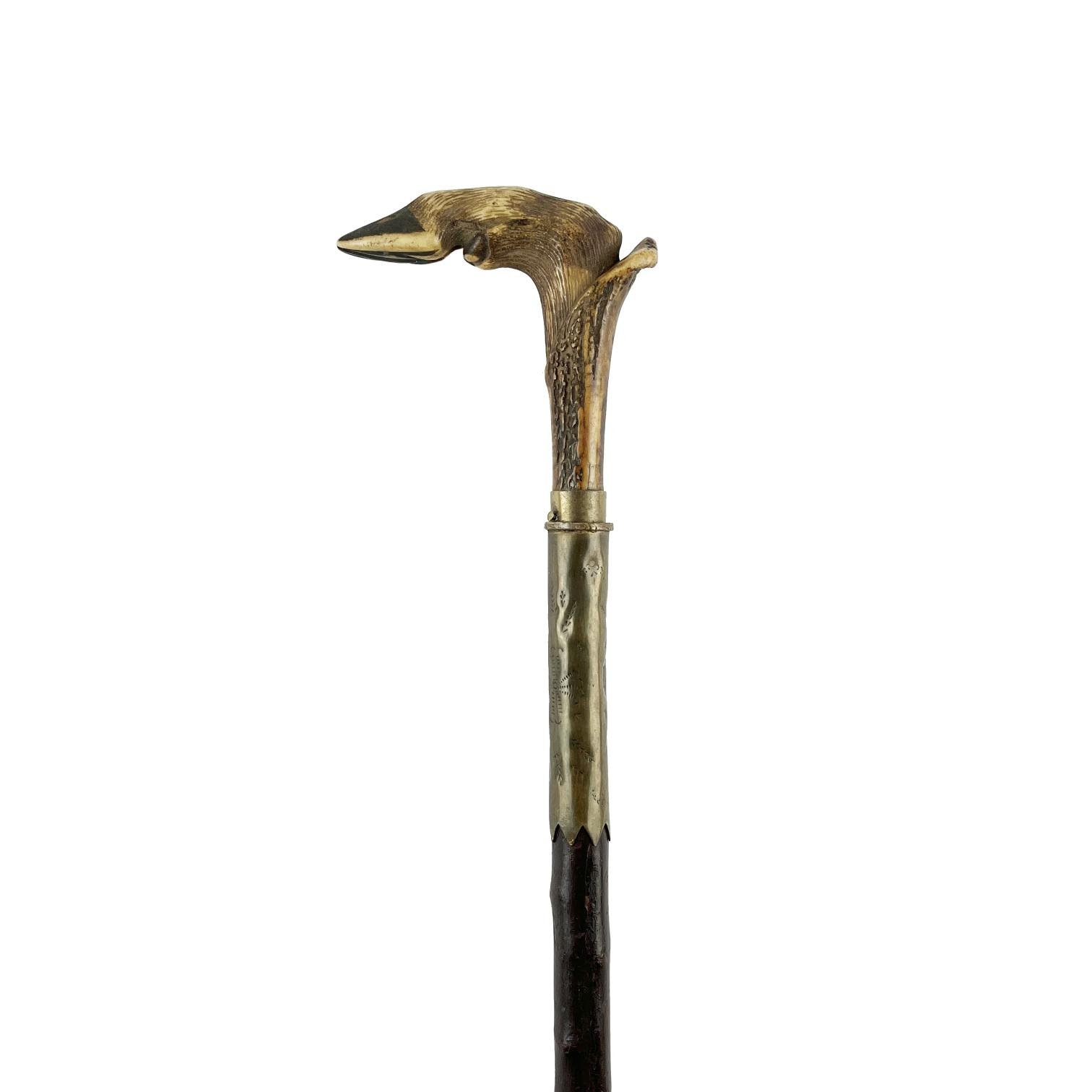 Arreador con estoque, en madera, con cabo en asta de ciervo tallada «pata de ciervo», con monturas en bronce y sotera en cuero trenzado.