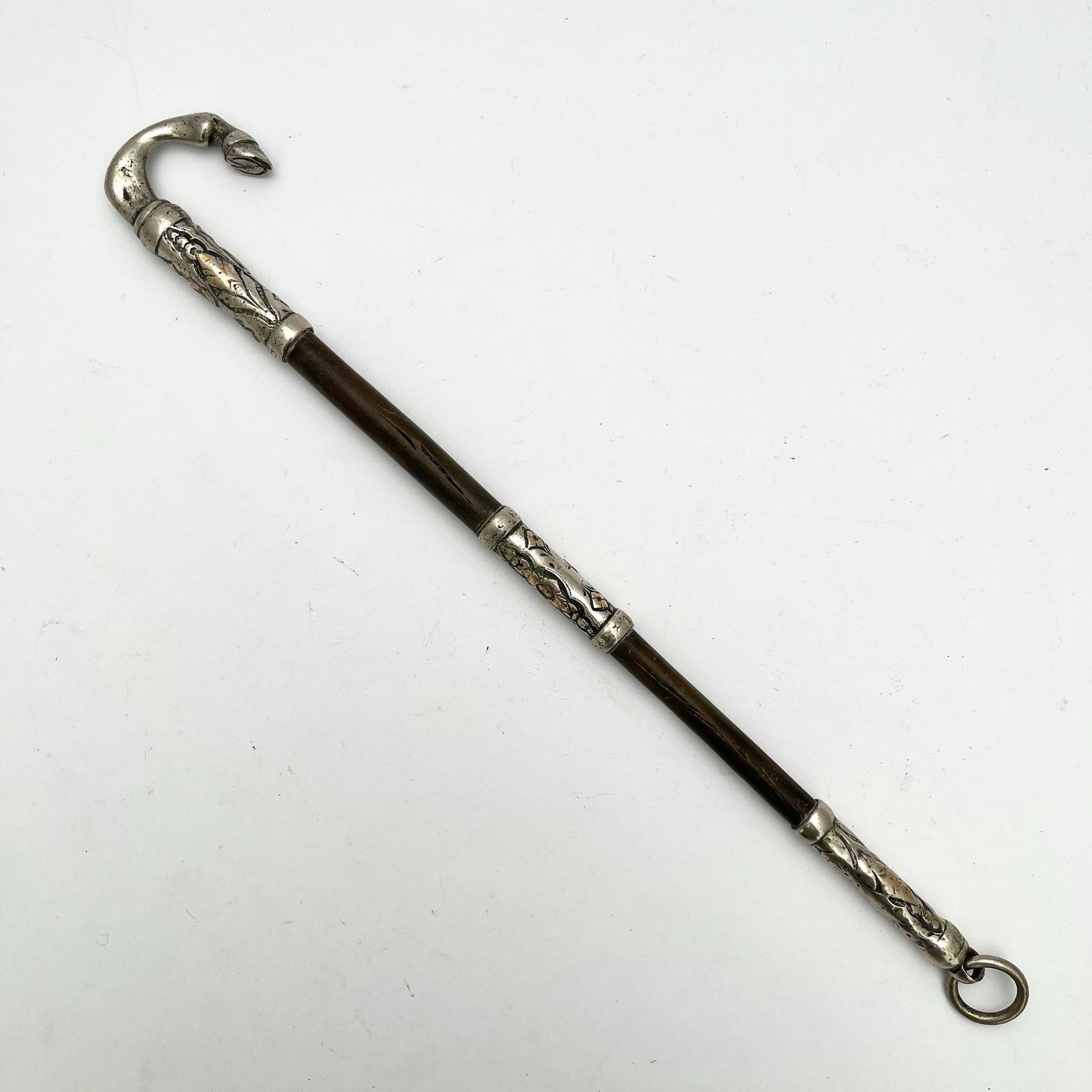 Arreador en bigote de ballena con cabo, pasador y puntera en plata y oro cincelados «hojas y flores», con cabo esculturado «pata de caballo» e iniciales en oro «C.P.». Presenta avería en bigote de ballena.