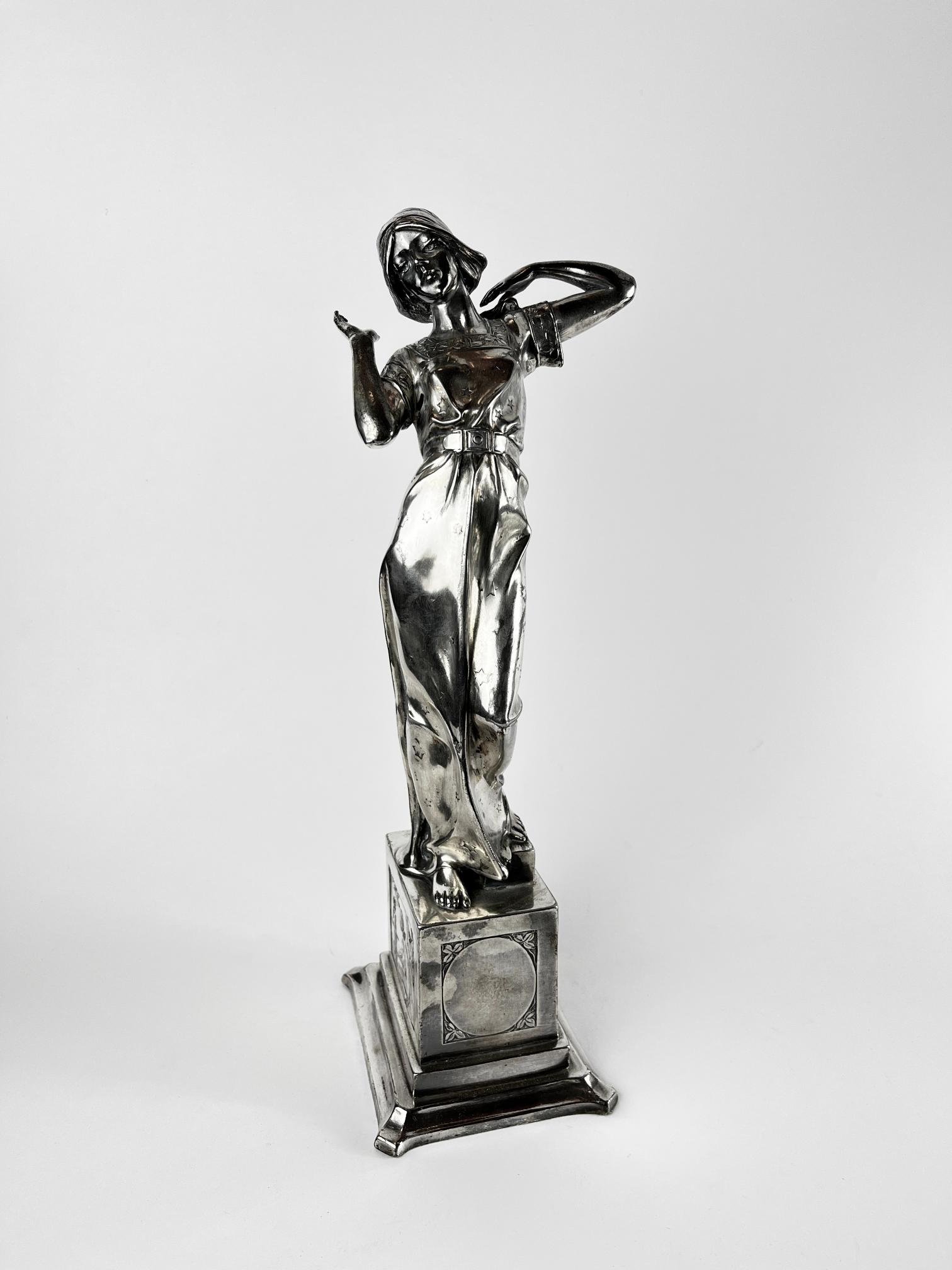 Escultura alemana art decó en metal plateado WMF «Joven dama en pedestal» 32 x 11 x 9 cm