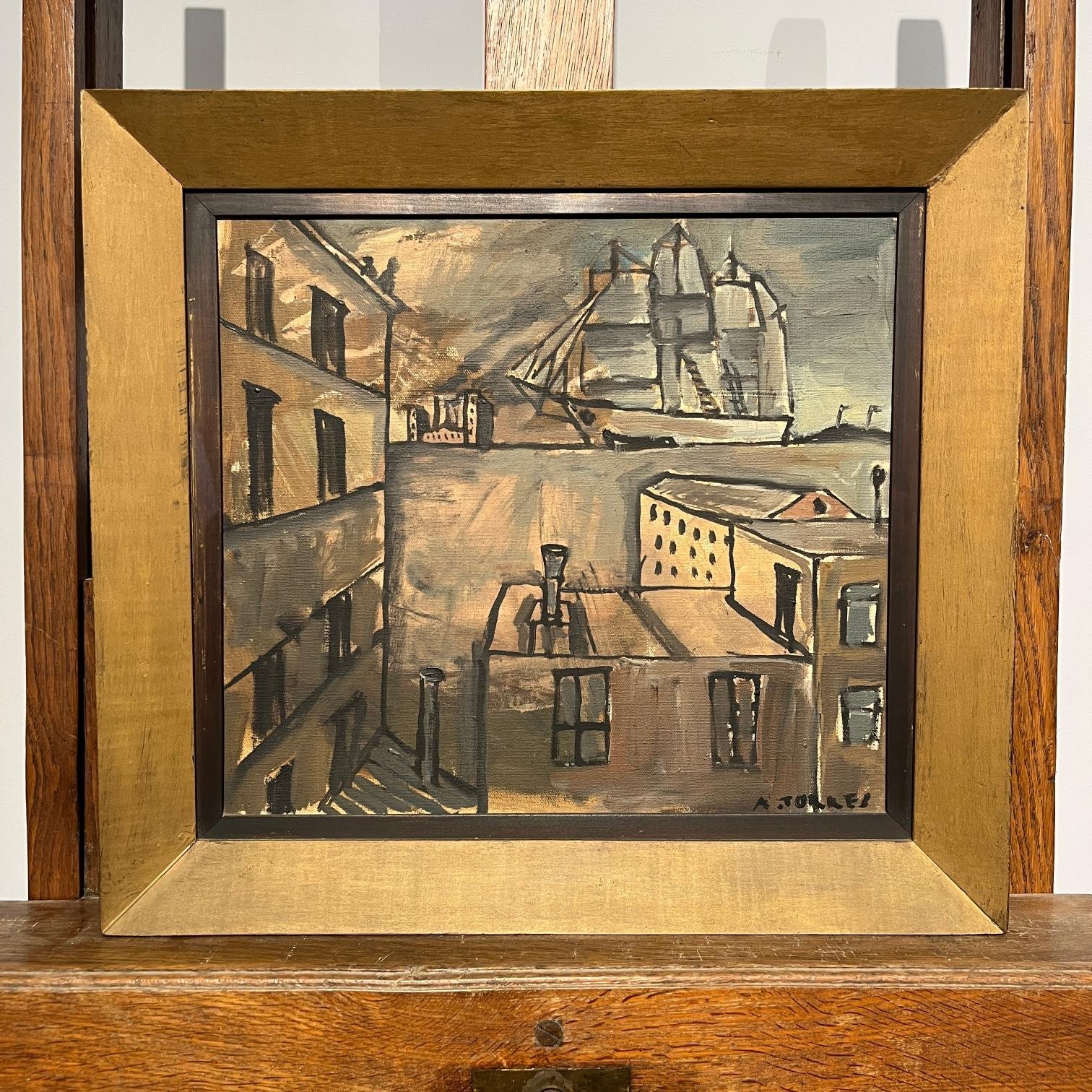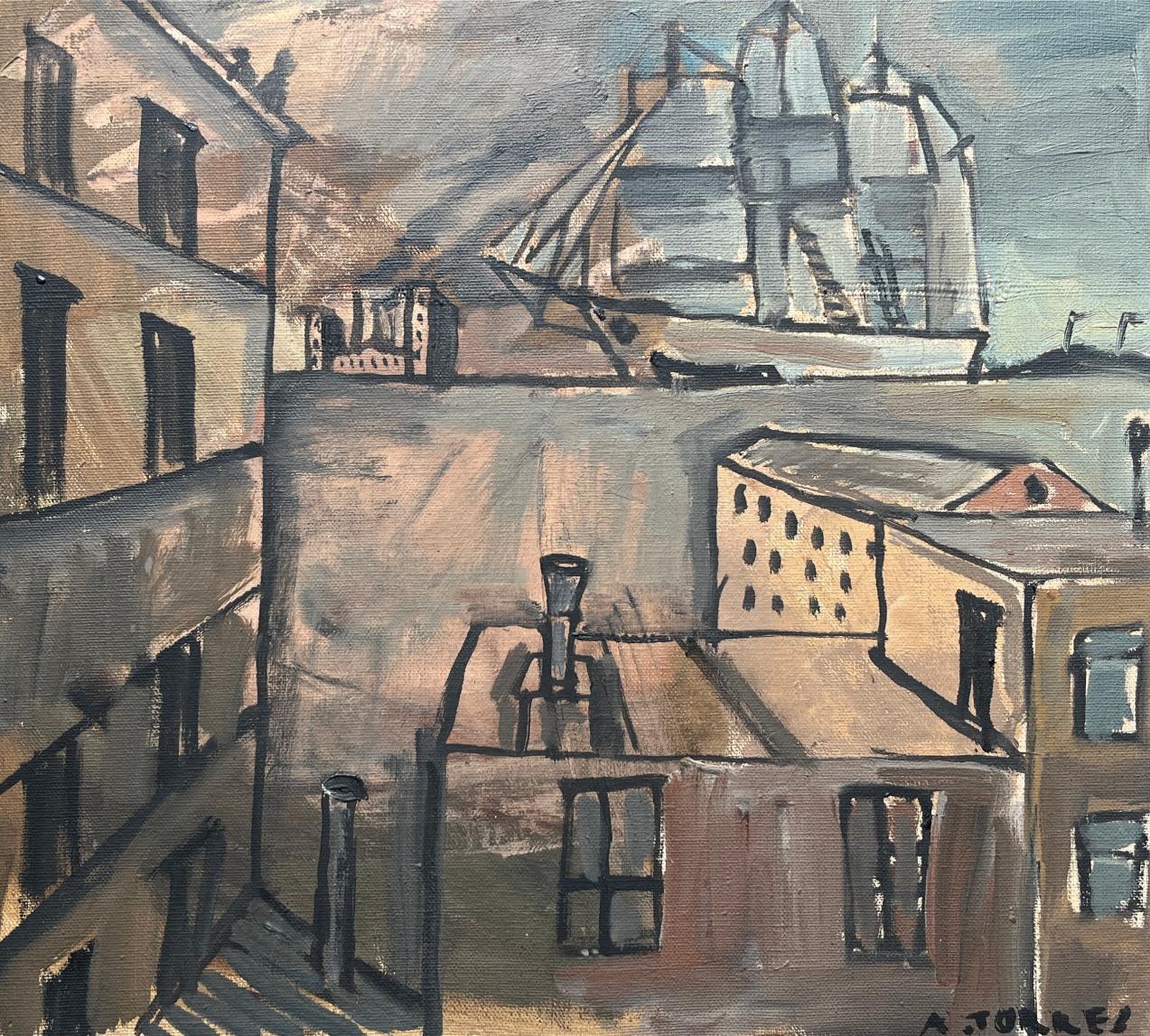 AUGUSTO TORRES (Escuela uruguaya, 1913-1992) Óleo sobre tela «Fragata en la bahía de Montevideo» Firmado abajo a la derecha 33 x 37 cm
