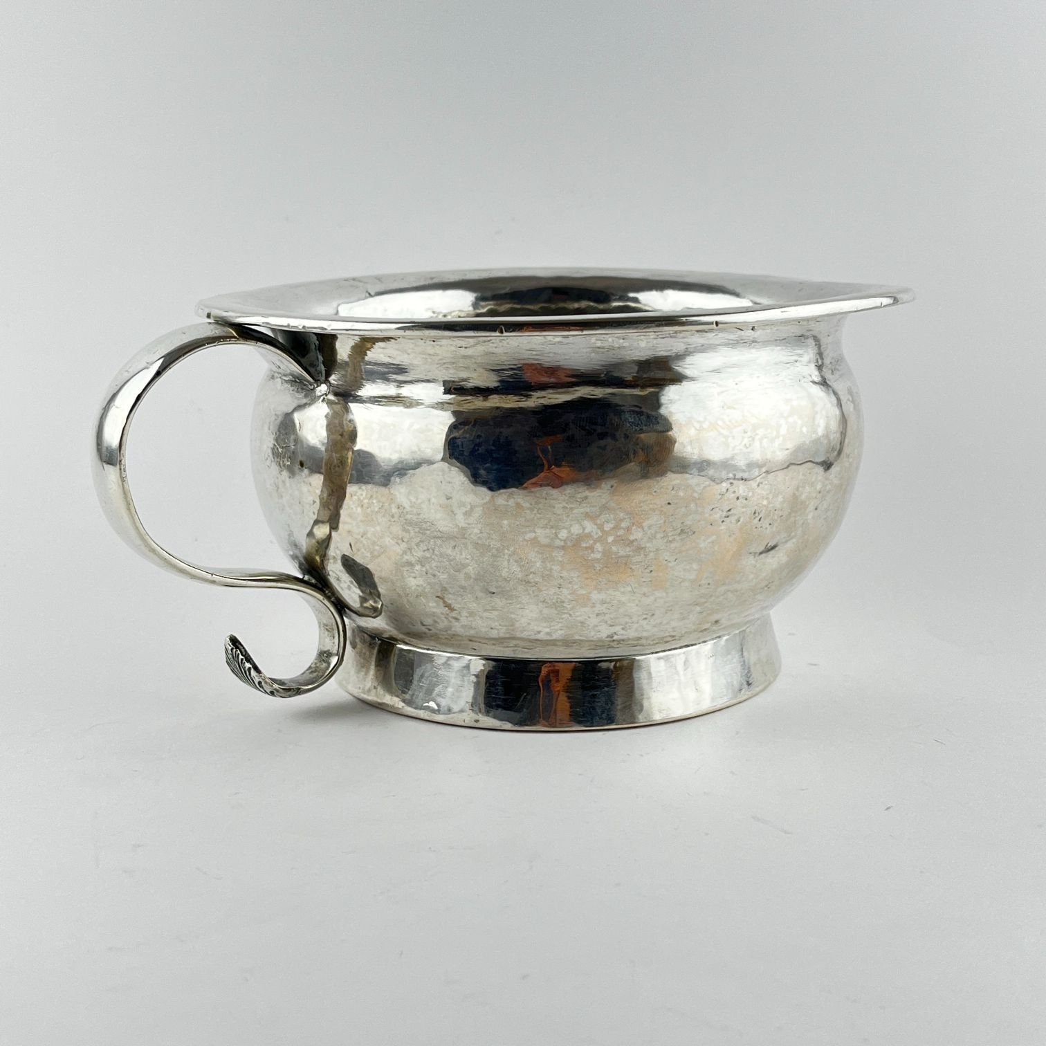 Bacinilla hispanoamericana s. XVIII en plata lisa batida con asa cincelada “hoja”. 11 x 19 cm.