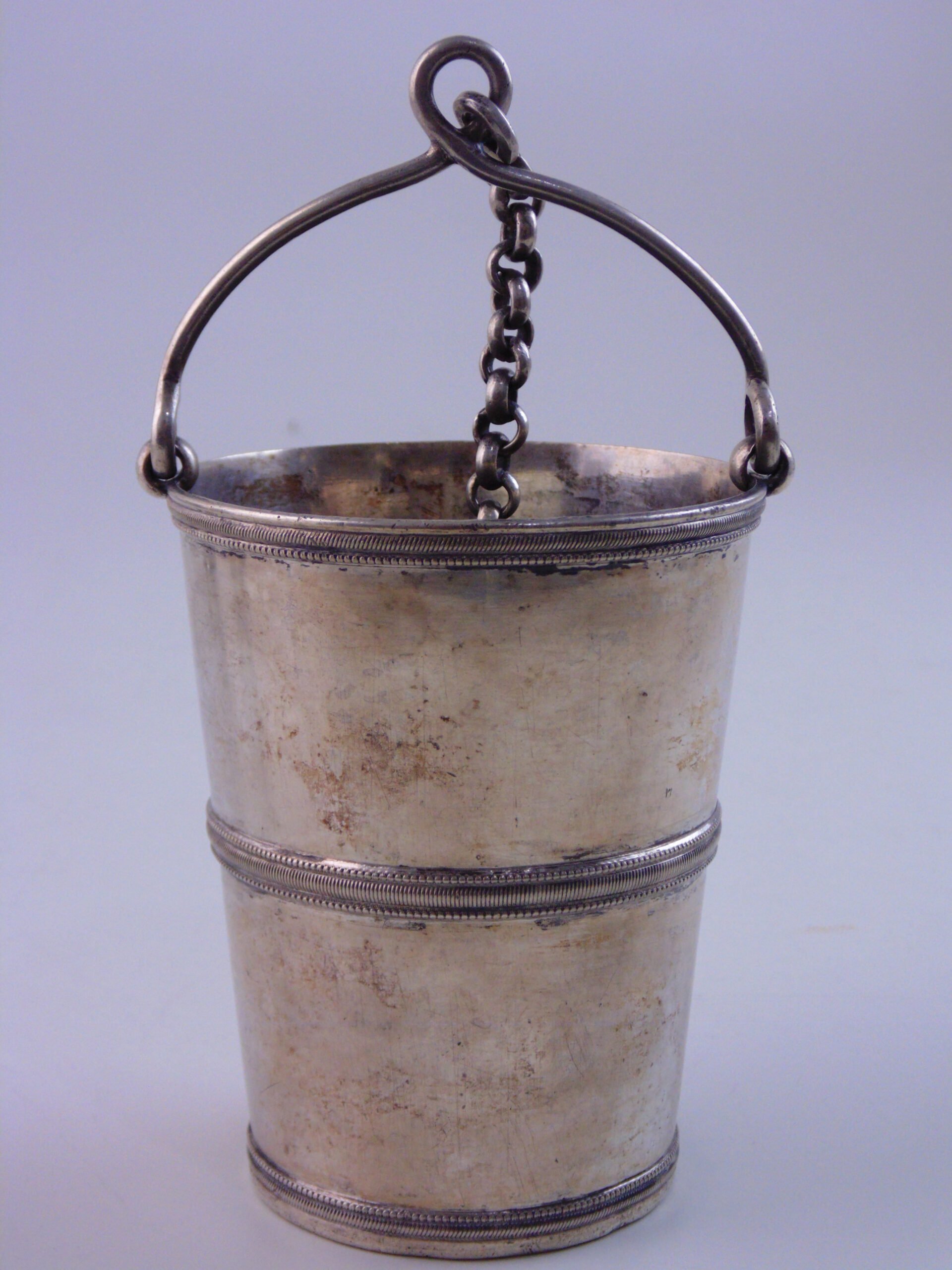 Balde brasileño de carruaje siglo XVIII en plata decorado con tres guardas cinceladas y cadenilla original. Alto 17 cm.