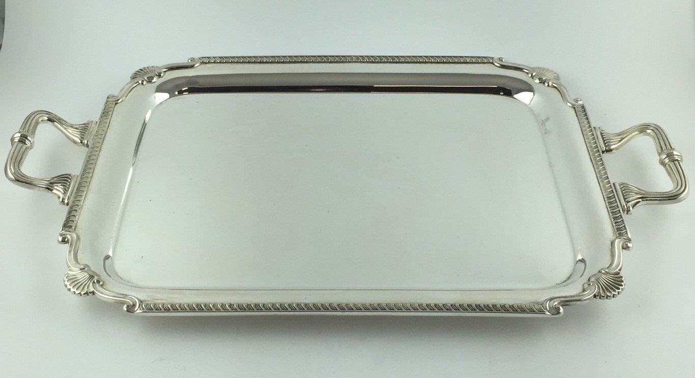 Bandeja de servir rectangular en metal plateado liso. Borde estriado decorado «valvas», con asas. 56 x 34 cm.