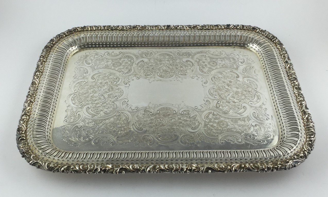 Juego de dos bandejas rectangulares en metal plateado Piña de Freccero cincelado «hojas y flores». Borde calado con guarda decorada «vides». 41 x 31 cm. 37 x 28 cm.