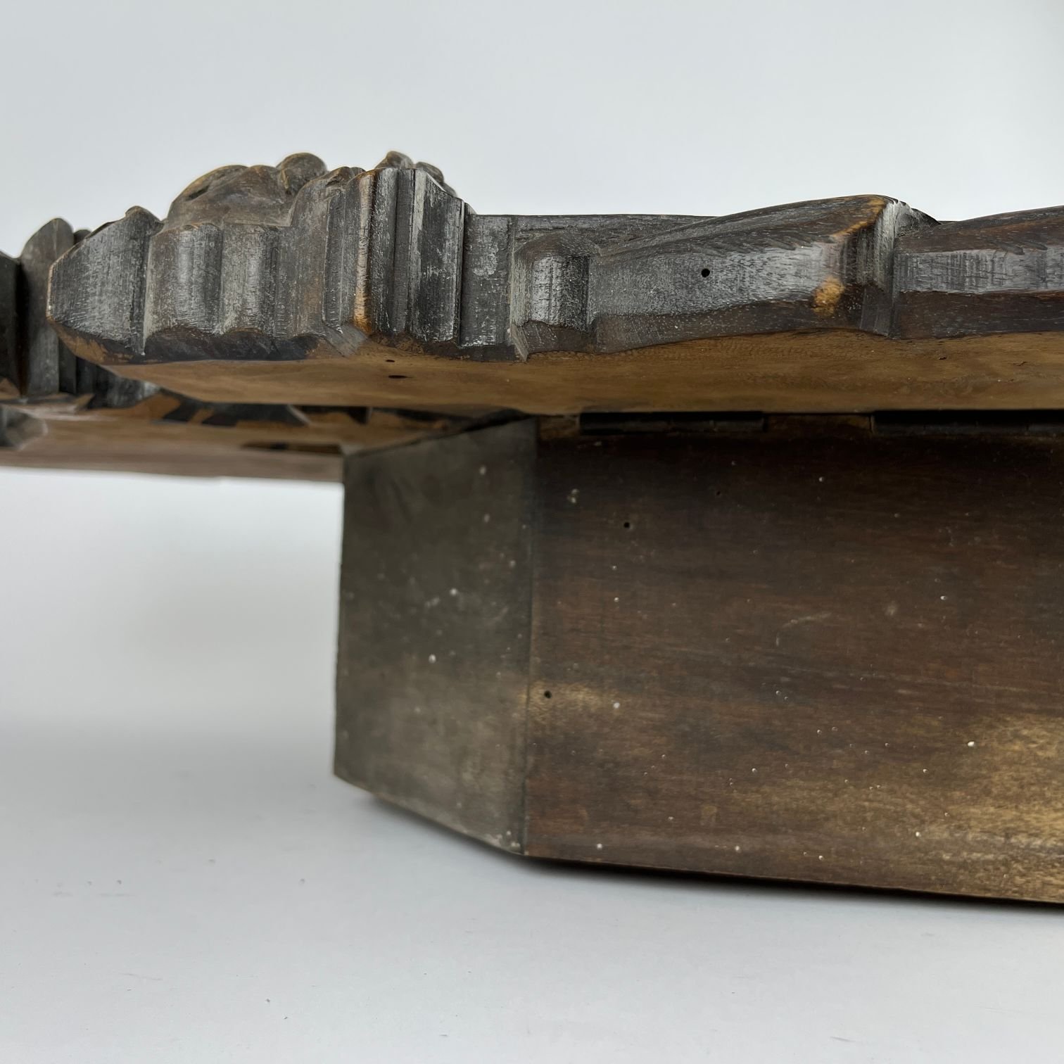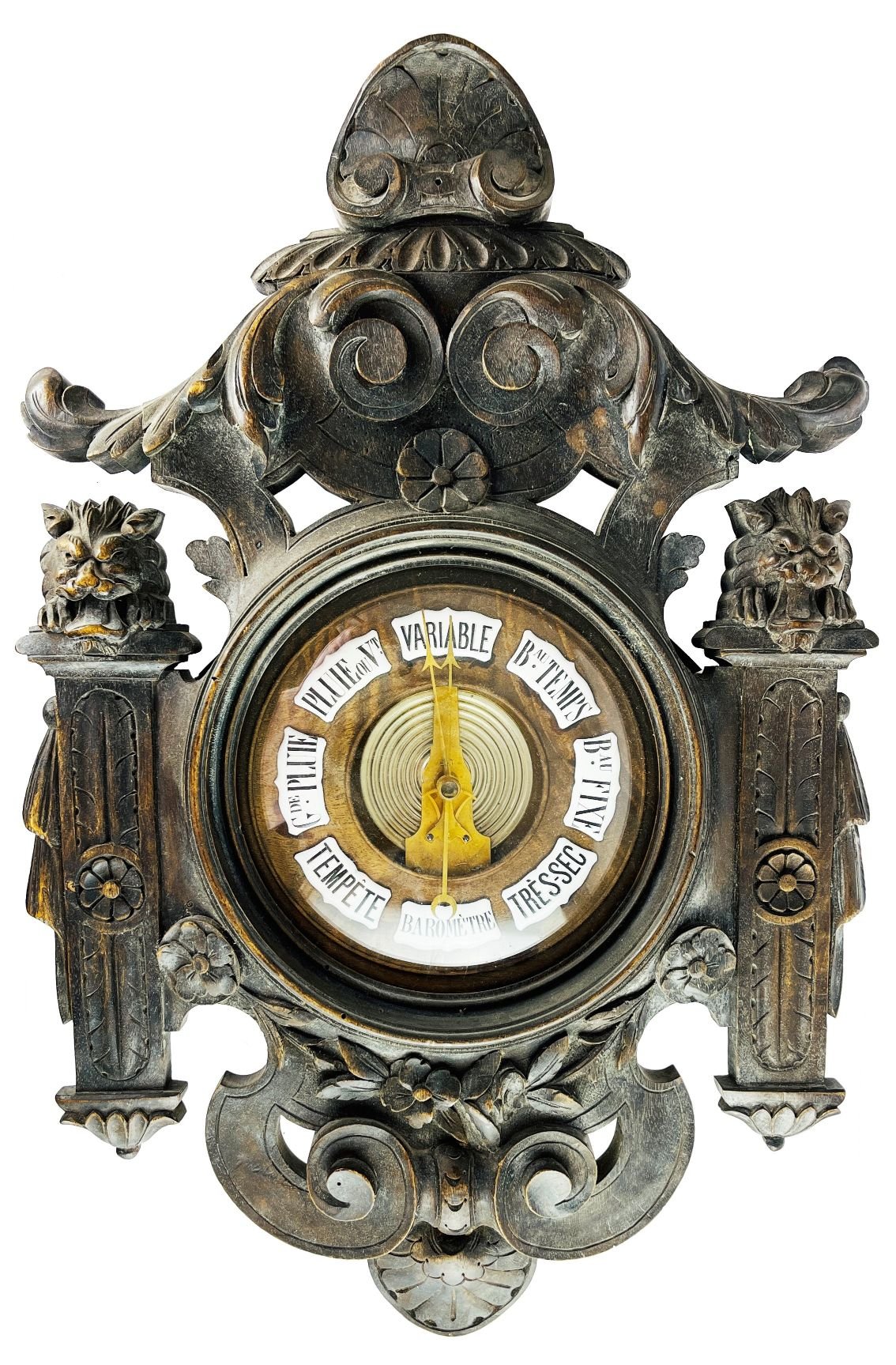 Barómetro francés de pared en nogal tallado y esculturado «leones», con cartelas de esfera en esmalte blanco y negro. 58 x 39 cm.