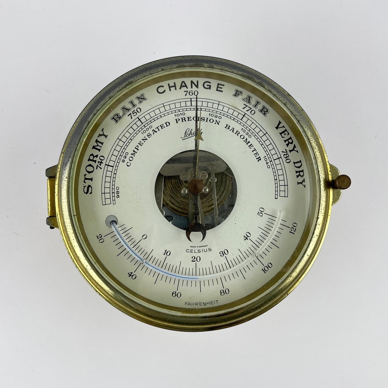 Barómetro termómetro alemán marca Schatz, con caja en bronce. Diámetro 17 cm.