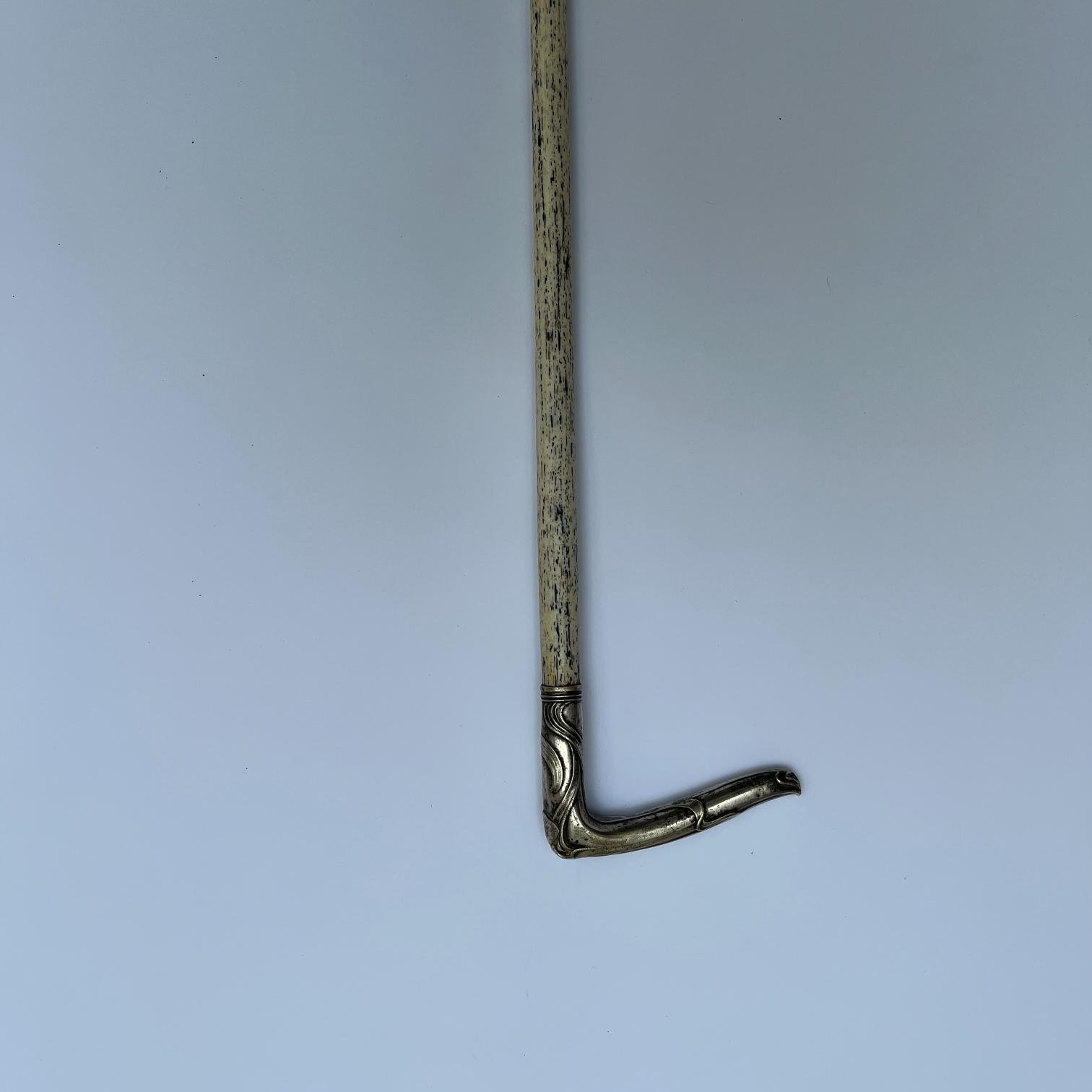 Bastón en hueso de ballena con cabo art nouveau en metal plateado y regatón en alpaca. Alto 90 cm.